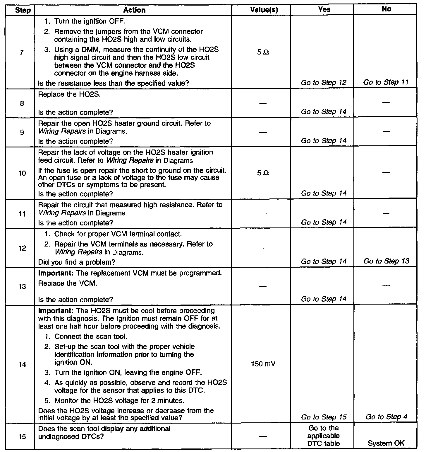 The numbers below refer to the step numbers on the diagnostic table.