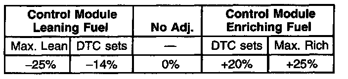 The fuel trim values table indicates the typical fuel adjustment values as displayed on a scan tool. Negative values, or a rich condition, indicates that the injector pulse width is being decreased in order to lean out the fuel mixture. Positive values, or a lean condition, indicates that the injector pulse width is being increased in order to richen the fuel mixture.
