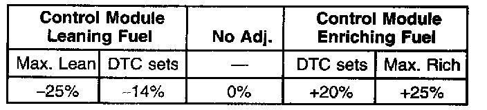 The fuel trim values table indicates the typical fuel adjustment values as displayed on a scan tool. Negative values, or a rich condition, indicates that the injector pulse width is being decreased in order to lean out the fuel mixture. Positive values, or a lean condition, indicates that the injector pulse width is being increased in order to richen the fuel mixture.