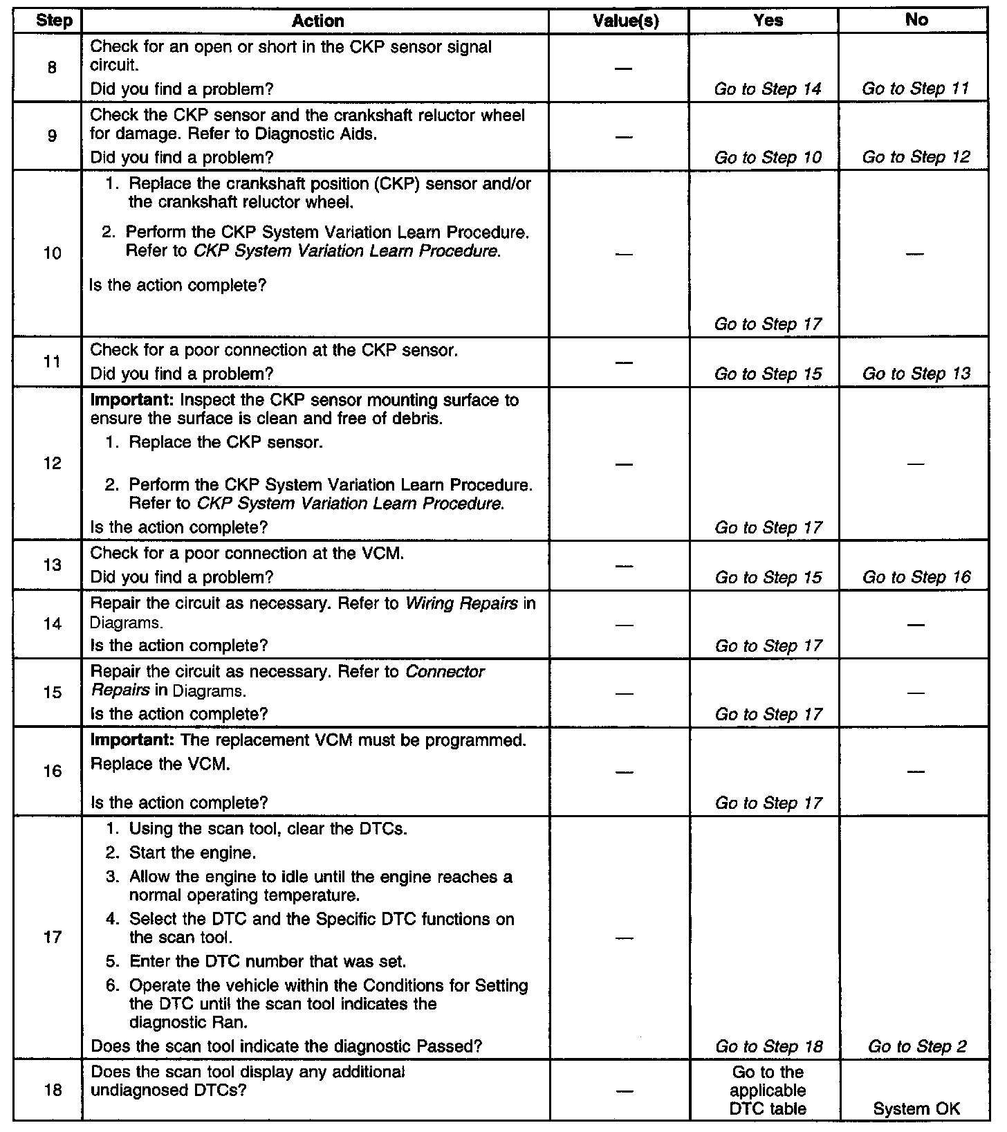If the VCM does not detect a CKP signal during engine cranking for a predetermined amount of time, this DTC will set.