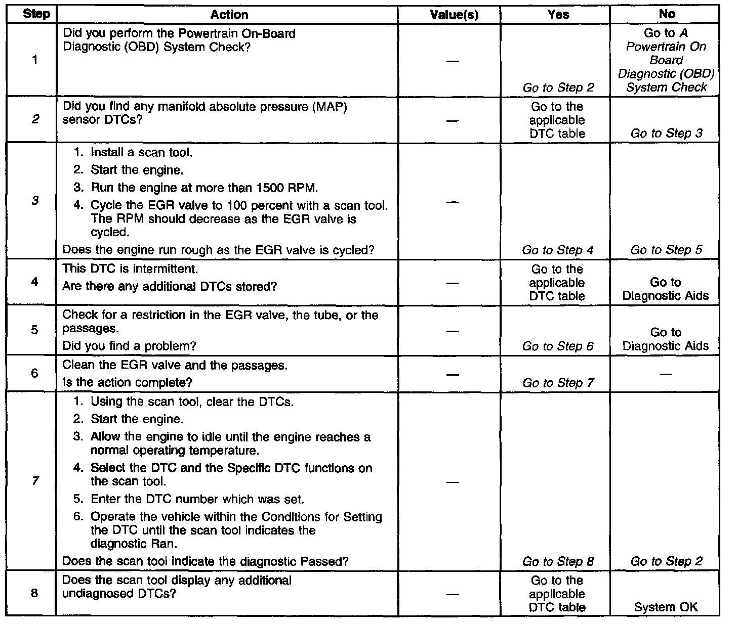 The VCM tests the EGR system during deceleration by momentarily commanding the EGR valve open. The pressure in the intake manifold increases when the EGR valve is open. The VCM monitors the Manifold Absolute Pressure (MAP) sensor signal during the EGR system diagnostic in order to determine the amount of EGR flow. The MAP sensor will detect an increase in the manifold pressure as the EGR is cycled ON. If the the manifold pressure measured is less than expected by the VCM, DTC P0401 will set.