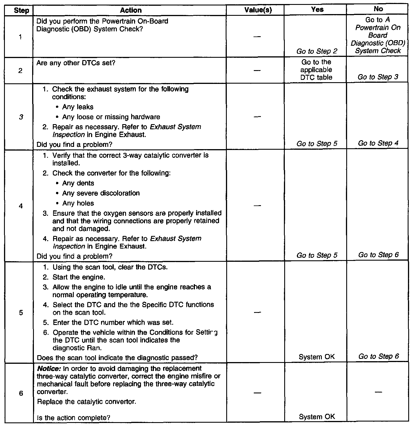 3. This table checks for conditions that can cause the 3-way catalytic converter efficiency to appear degraded. Inspect and repair the exhaust system as necessary. Refer to Exhaust System Inspection in Engine Exhaust.