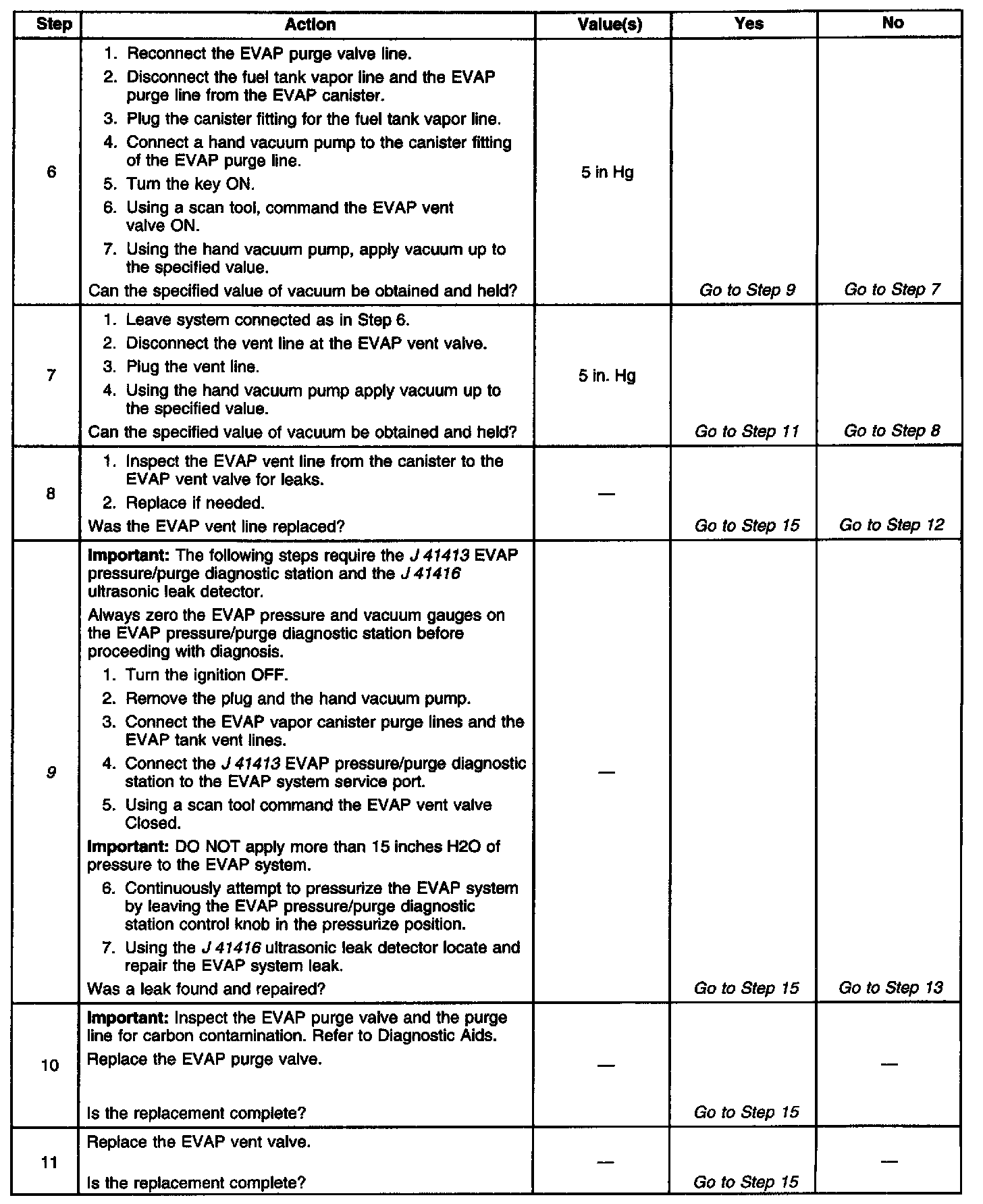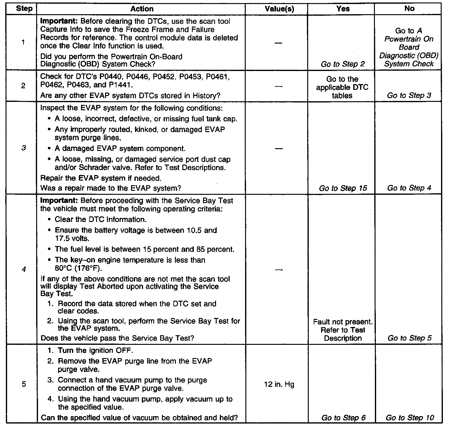 IMPORTANT: An accurate indication of fuel level is required for the VCM to properly Pass or Fail this DTC. Always diagnose fuel level sensor DTCs before performing this DTCs diagnostic table. Always check for fuel level sensor DTCs stored in History.