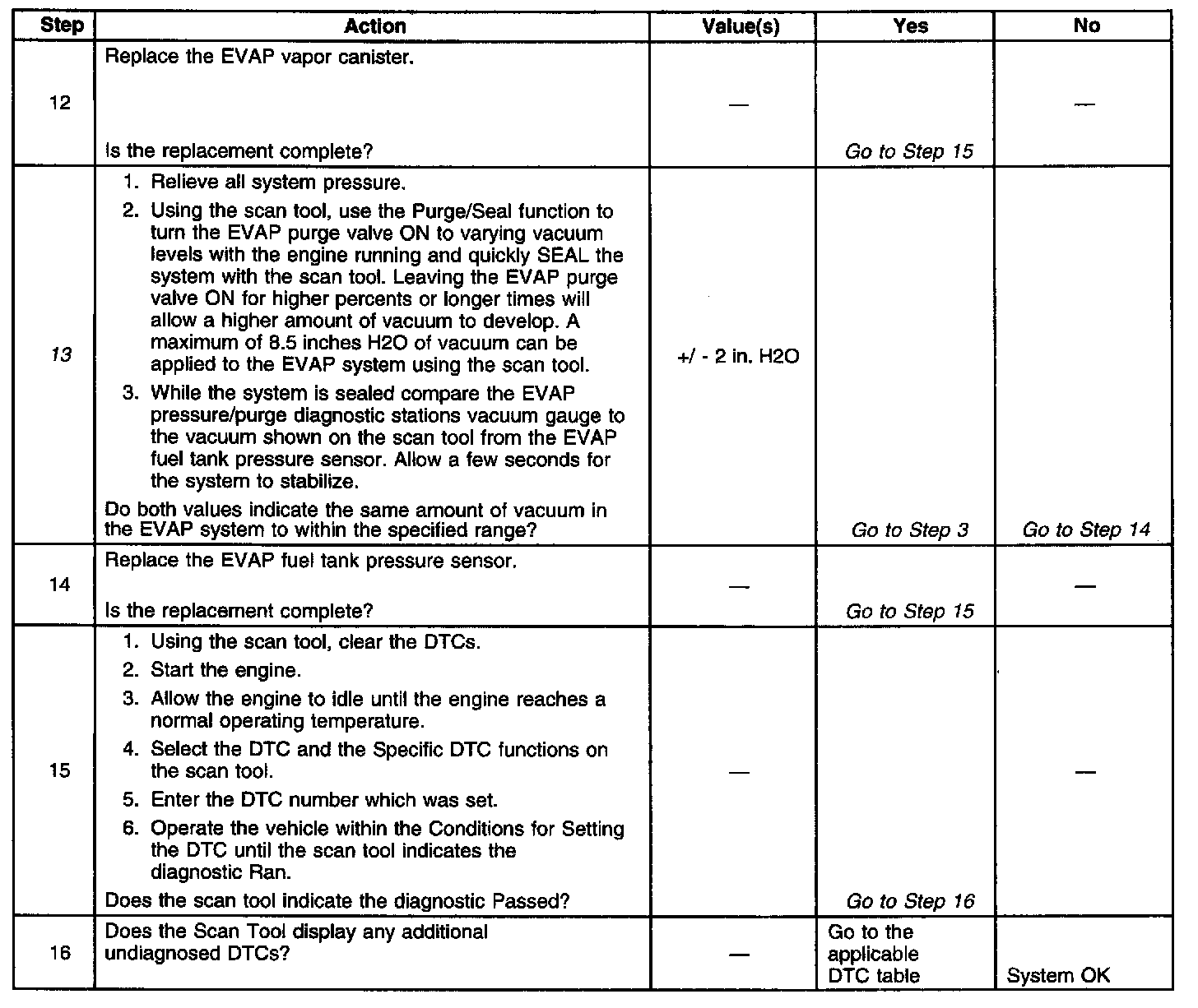 13. An EVAP pressure sensor that does not correctly respond to pressure or vacuum will cause this DTC to set.