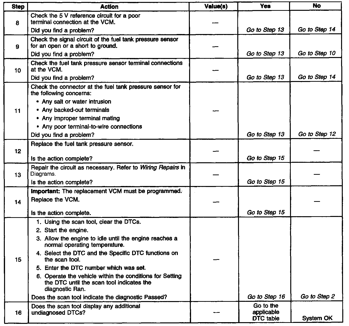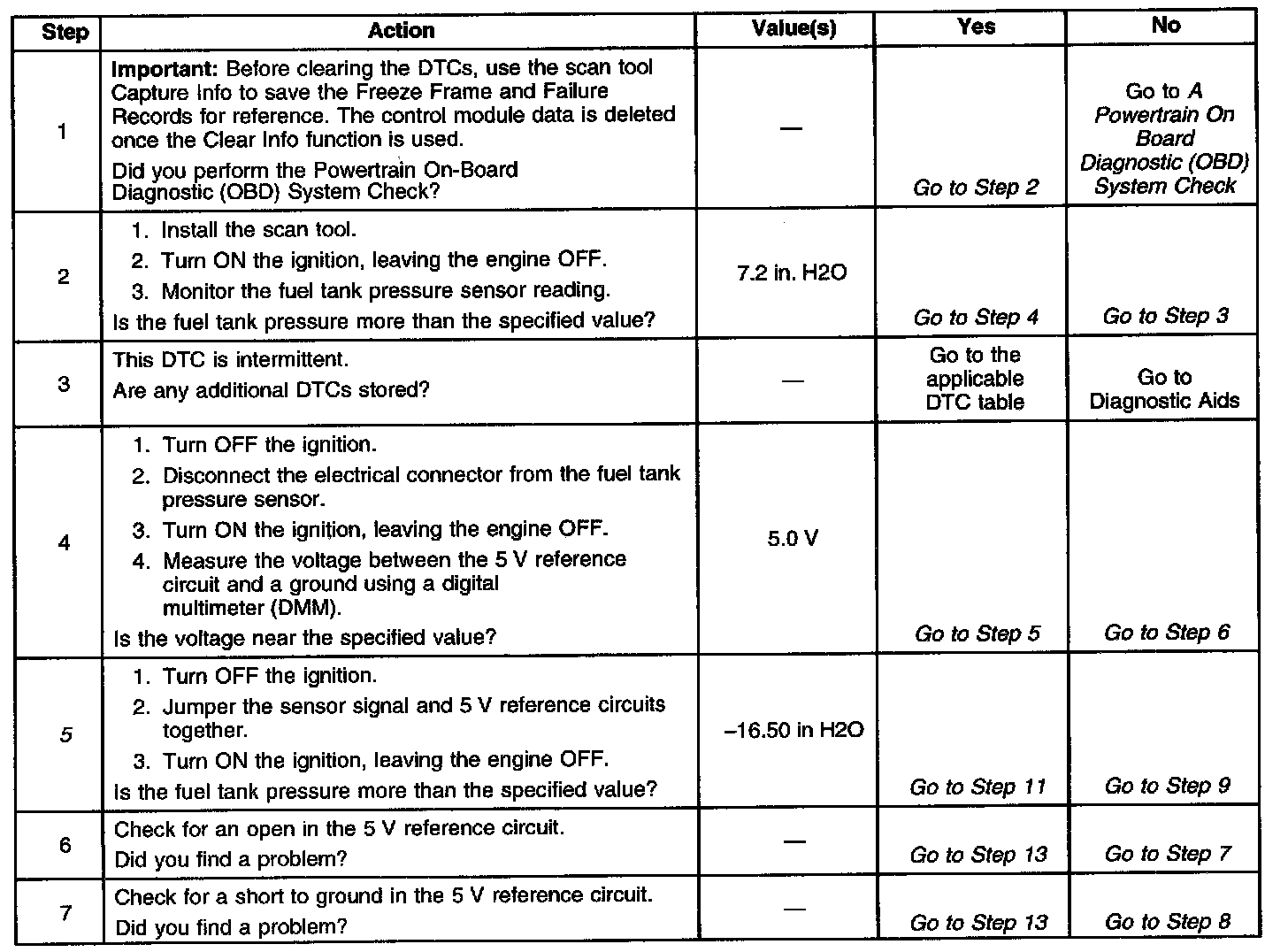 The Fuel Tank Pressure display on the scan tool has an auto-zero feature which occurs at each ignition cycle and is corrected according to the barometric pressure. Because of this, the Fuel Tank Pressure display may not accurately reflect the actual output of the sensor or the conditions within the fuel tank. The diagnostic table is intended to isolate and diagnose the electrical problems with the sensor wiring or the sensor.