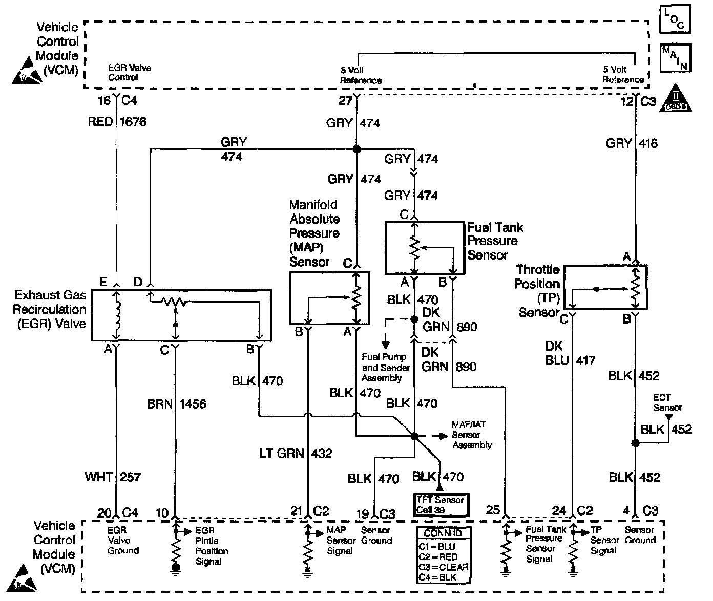 The fuel tank pressure sensor responds to changes in the fuel tank pressure or vacuum. This information is used in order to detect vacuum decay or an excessive vacuum during the EVAP diagnostic routing. The fuel tank pressure sensor signal voltage to the VCM varies from a minimum of about 0.1 volts with pressure in the fuel tank to more than 4.0 volts with a high vacuum in the fuel tank.
