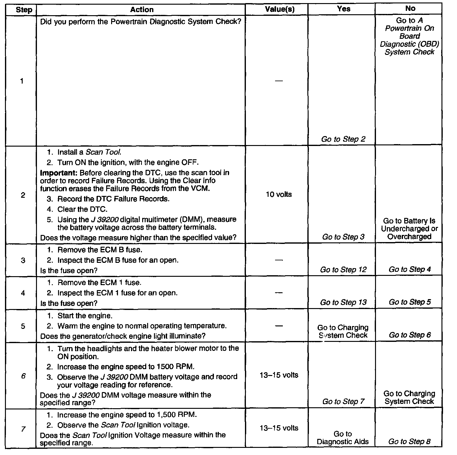The numbers below refer to the step numbers on the diagnostic table.