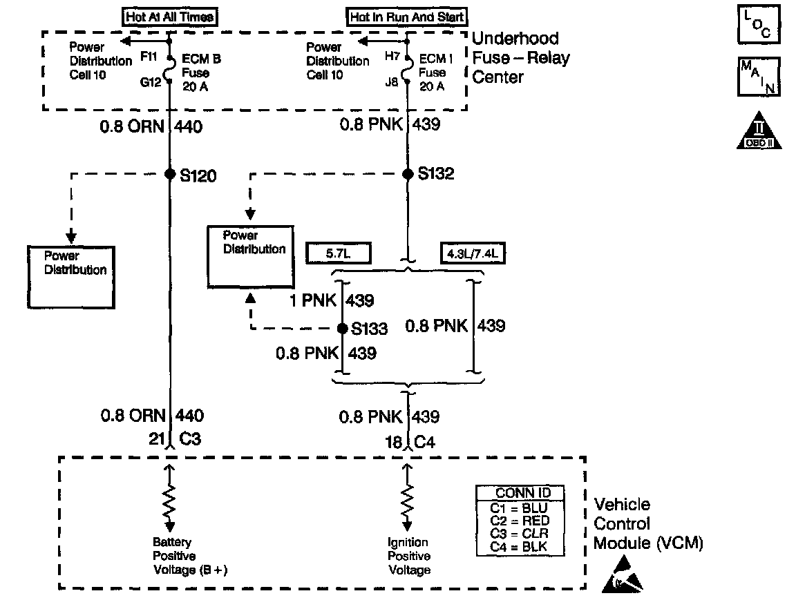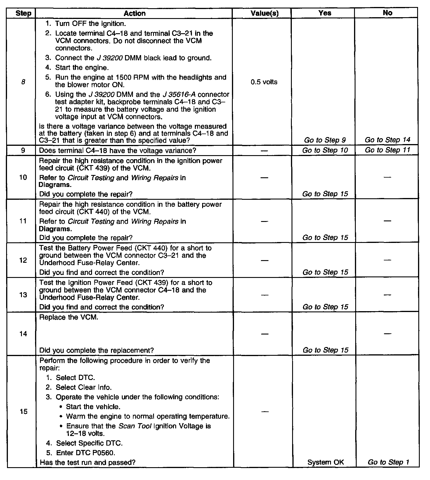 Circuits 439 is the ignition voltage feed for the Vehicle Control Module (VCM). Circuit 440 is the battery voltage teed for the VCM. If the VCM detects a low voltage, a high voltage for a long time, or a high voltage, for a short amount of time, then DTC P0560 sets. DTC P0560 is a type C DTC.