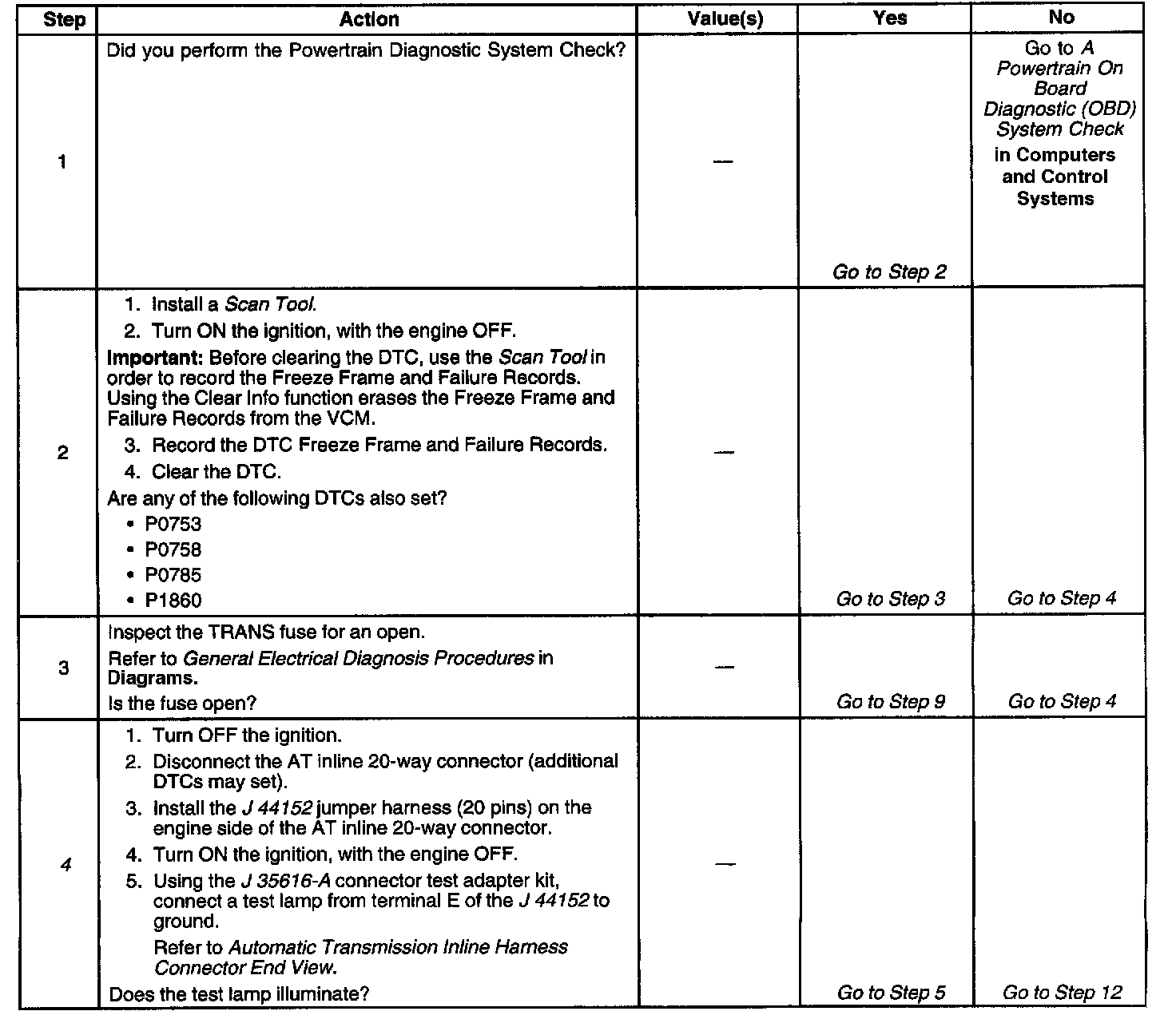 The numbers below refer to the step numbers on the diagnostic table.