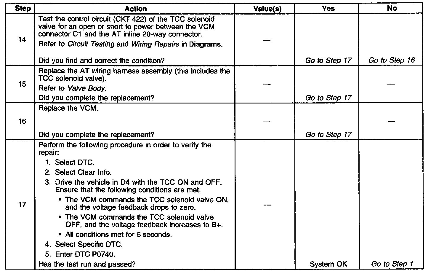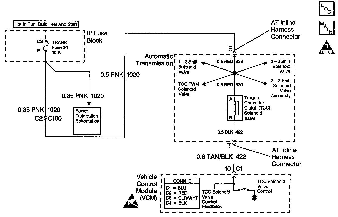 The Torque Converter Clutch (TCC) solenoid valve is an electrical device that is used with the Torque Converter Clutch Pulse Width Modulation (TCC PWM) solenoid valve in order to control TCC apply and release. The TCC solenoid valve attaches to the transmission case assembly extending into the pump cover. The TCC solenoid valve receives ignition voltage through circuit 1020. The Vehicle Control Module (VCM) controls the solenoid by providing the ground path on circuit 422. The VCM monitors the Throttle Position (TP) voltage, the vehicle speed, and other inputs in order to determine when to energize the TCC solenoid valve. When the VCM detects a continuous open, short to ground, or short to power in the TCC solenoid valve circuit, then DTC P0740 sets. DTC P0740 is a type A DTC.