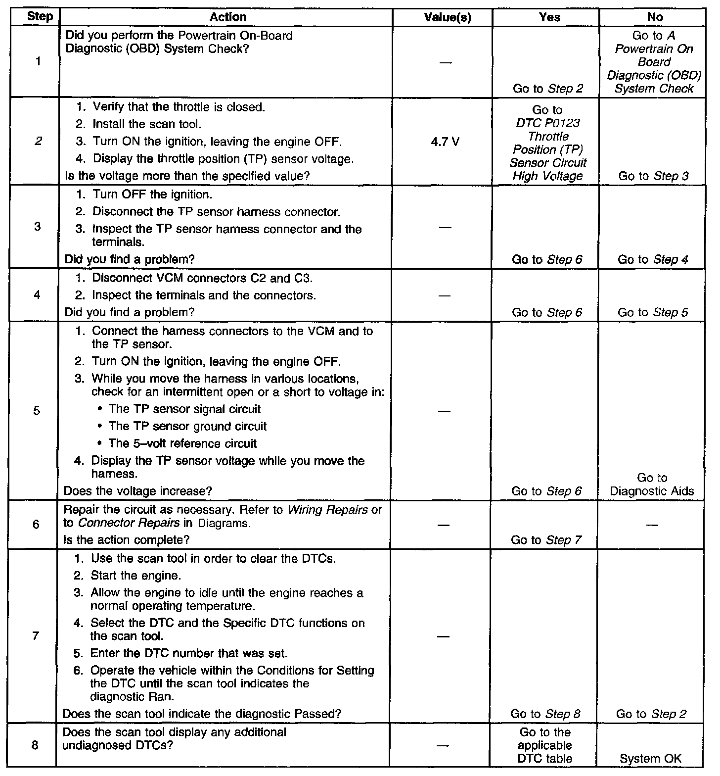 2. If the TP sensor voltage is more than 4.7 volts, the condition is present. Even though DTC P0123 did not set, this DTC is more comprehensive and may aid in diagnosis.