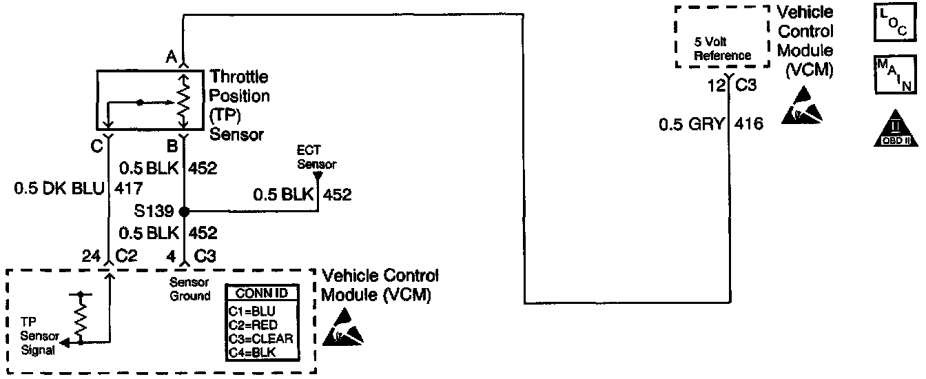 The Throttle Position (TP) sensor is a potentiometer. The control module supplies the TP sensor a reference voltage, a signal, and ground circuits. When the throttle is depressed, the TP sensor signal rises to near the reference voltage. When the throttle is released, the TP sensor signal decreases from the reference voltage. The control module monitors the TP sensor signal circuit voltage in order to determine the throttle blade angle, or opening.
