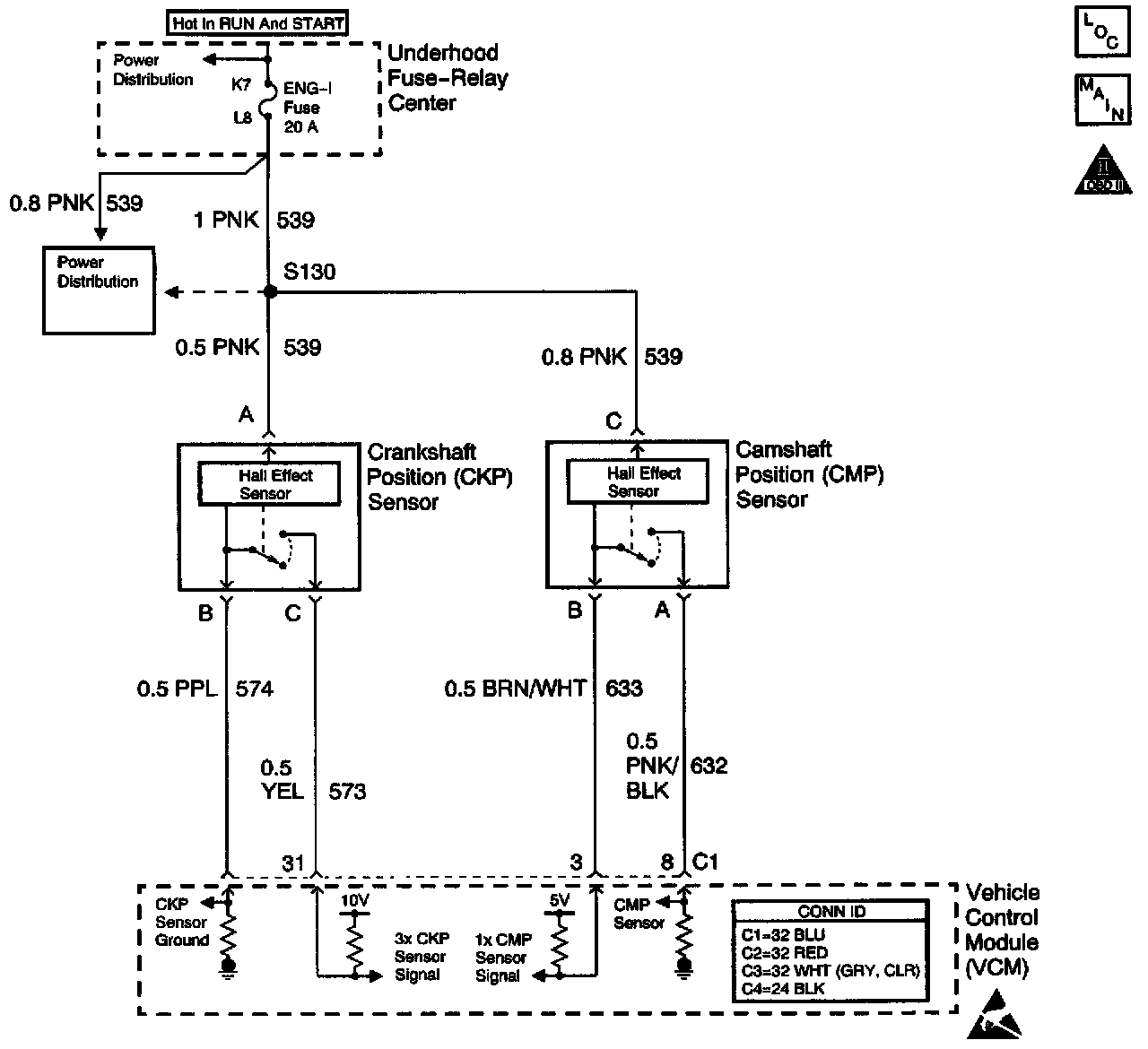 The Crankshaft Position (CKP) sensor is mounted in the front of the engine behind the harmonic balancer. The CKP sensor works in conjunction with a 3X (4X on V8 applications) reluctor wheel mounted on the front of the crankshaft. The CKP sensor has a B+ power supply, a ground, and a signal circuit.