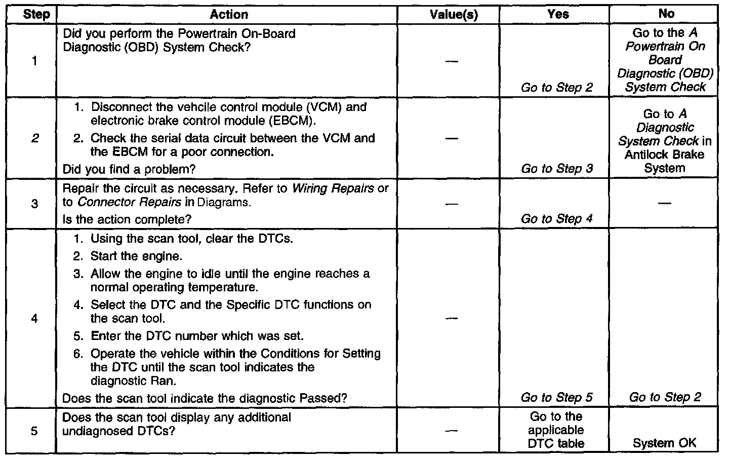 This Diagnostic Trouble Code (DTC) is used to determine when the Electronic Brake Control Module (EBCM) has lost the ability to provide rough road data to the control module for misfire detection (DTC P0300). When the control module detects this condition on the Class 2 Serial Data circuit, this DTC will be set.