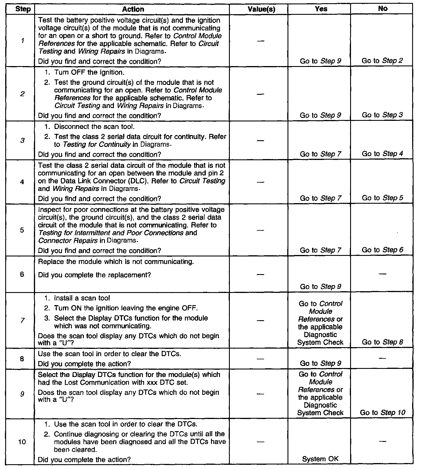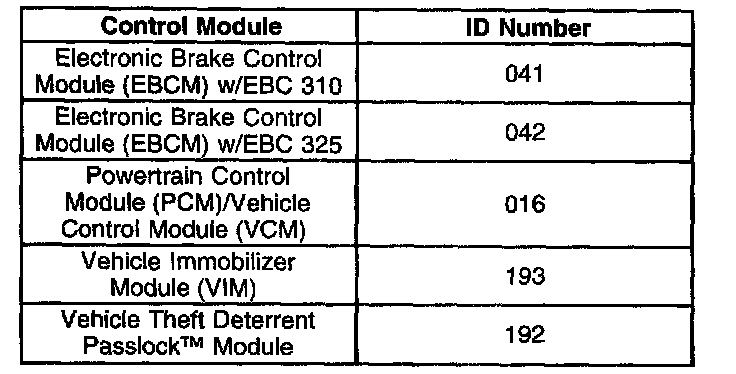 The Control Module ID Number list provides a method for determining which module is not communicating. A module with an internal class 2 serial data circuit malfunction or which loses power during the current ignition cycle would have a Lost Communication DTC set by other modules. The modules that can communicate will set a DTC indicating the module that cannot communicate. When no message is detected from a learned identification number for five seconds, a DTC U1 XXX (where XX is equal to the three digit identification number) is set.