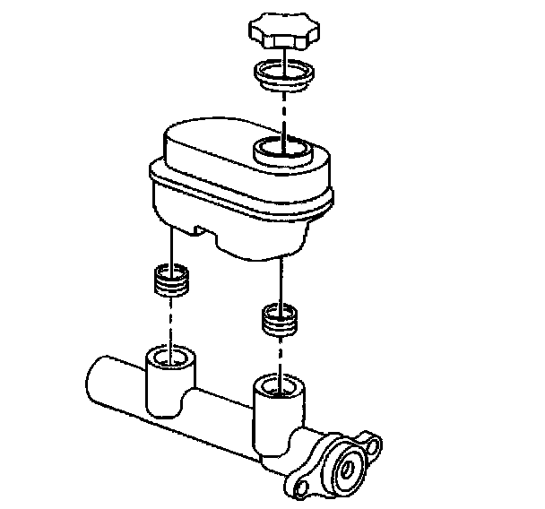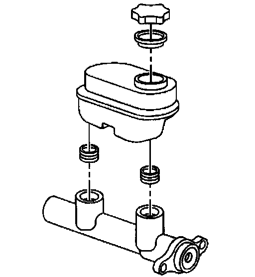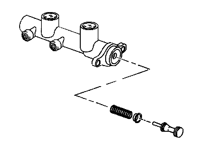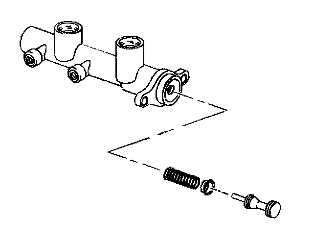 Disassembly ProcedureNotice: Do not hone the master cylinder bore. When the brake master cylinder is overhauled, it is recommended that the cylinder body be replaced rather than CLEANED UP by honing the bore. The master cylinder has a hard, highly polished BEARINGIZED surface, which is produced by diamond boring followed by ball or roller burnishing under heavy pressure. Honing will destroy this hard smooth surface and cause rapid wear of the rubber cups.