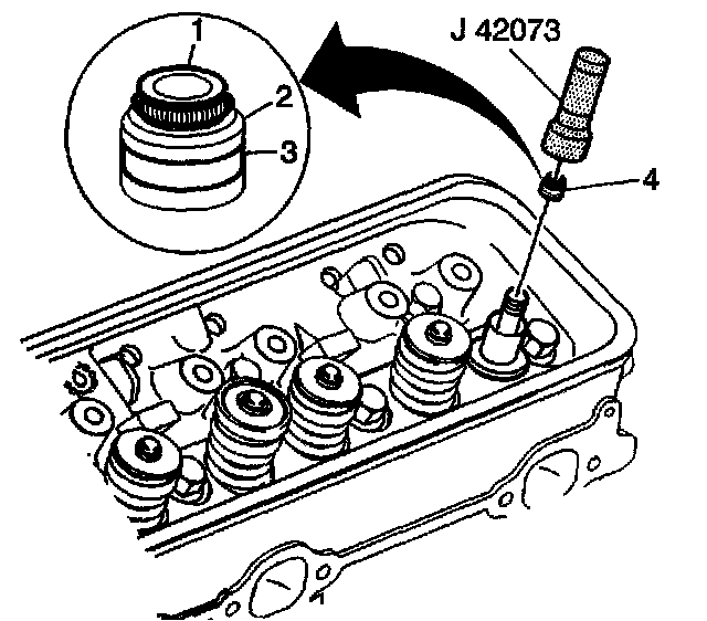 Tap the valve stem oil seal onto the valve guide until the J42073 bottoms against the valve spring seat.