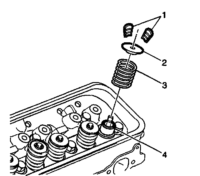8. Install the valve spring cap (2) onto the valve spring (3) and over the valve stem.