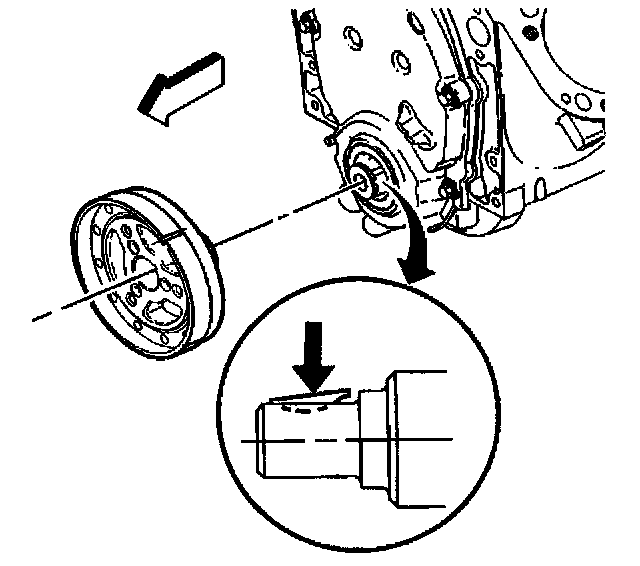 2. Apply a small amount of adhesive GM P/N 12346141 or equivalent onto the crankshaft balancer keyway in order to seal the crankshaft balancer keyway and crankshaft joint.