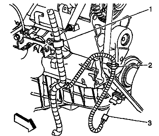 15. Remove the engine wiring harness clip (2) at the front of the engine.