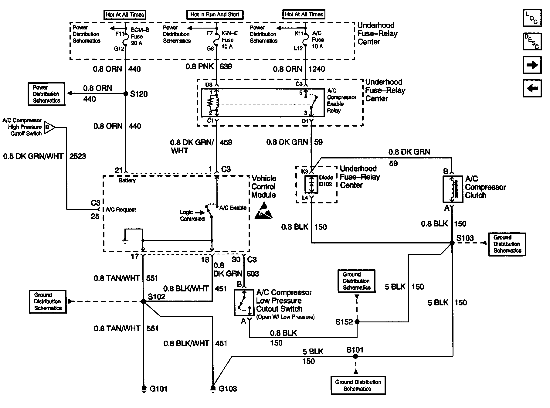 HVAC Compressor Control Schematics: ECM-B, IGN-E, A/C Fuses; Compressor Clutch, A/C Compressor Low Pressure Cutout Switch, G101, G103: