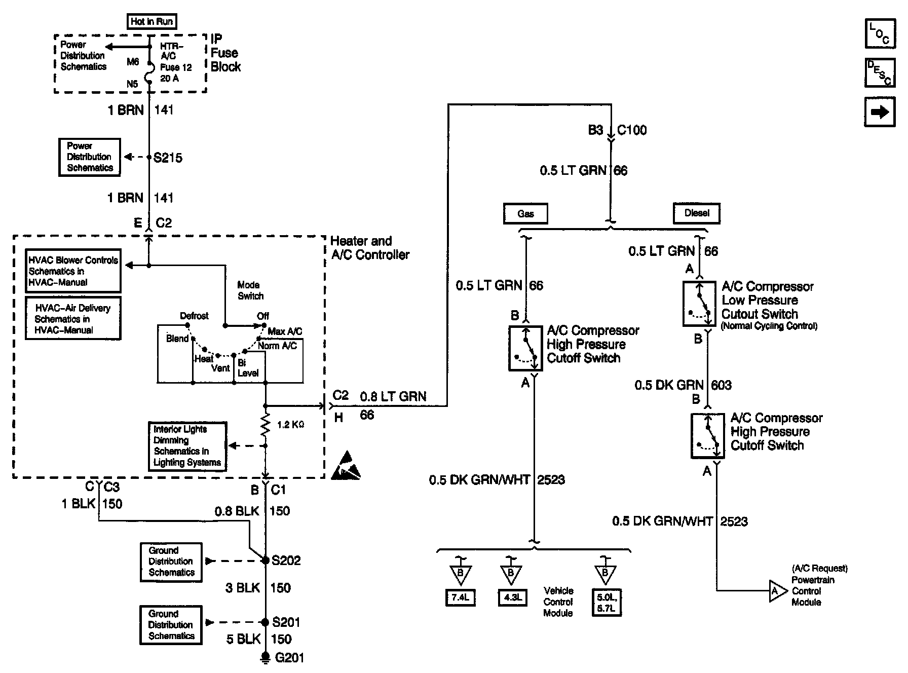 HVAC Compressor Control Schematics (HTR-A/C Fuse, A/C Compressor High Pressure Cutoff Switch, A/C Compressor Low Pressure Cutout Switch (Diesel), G201: