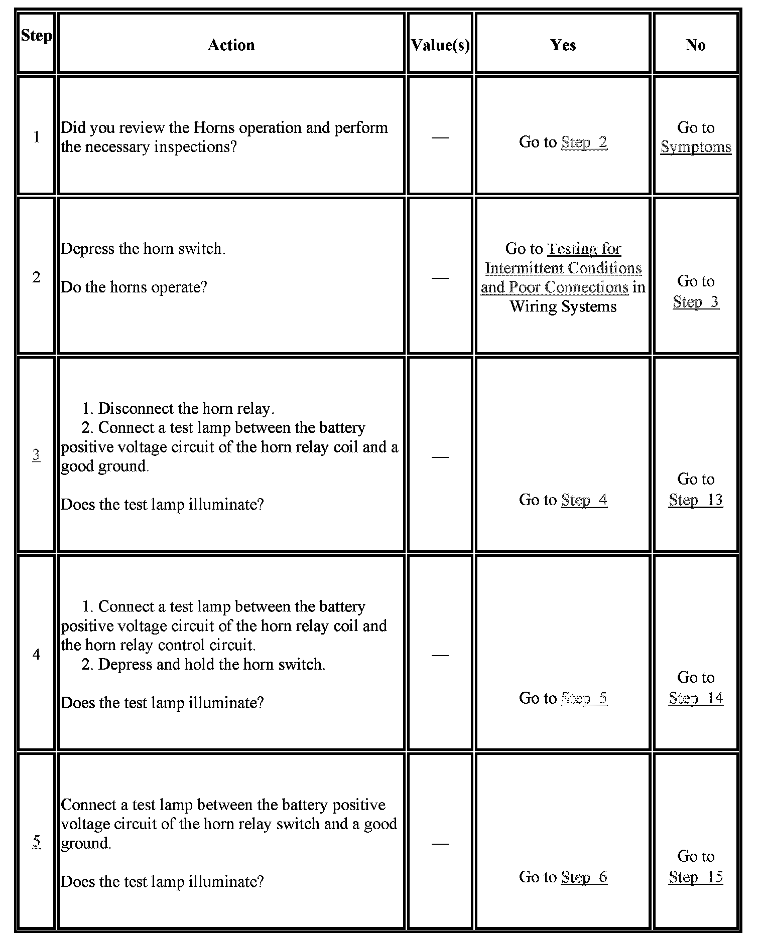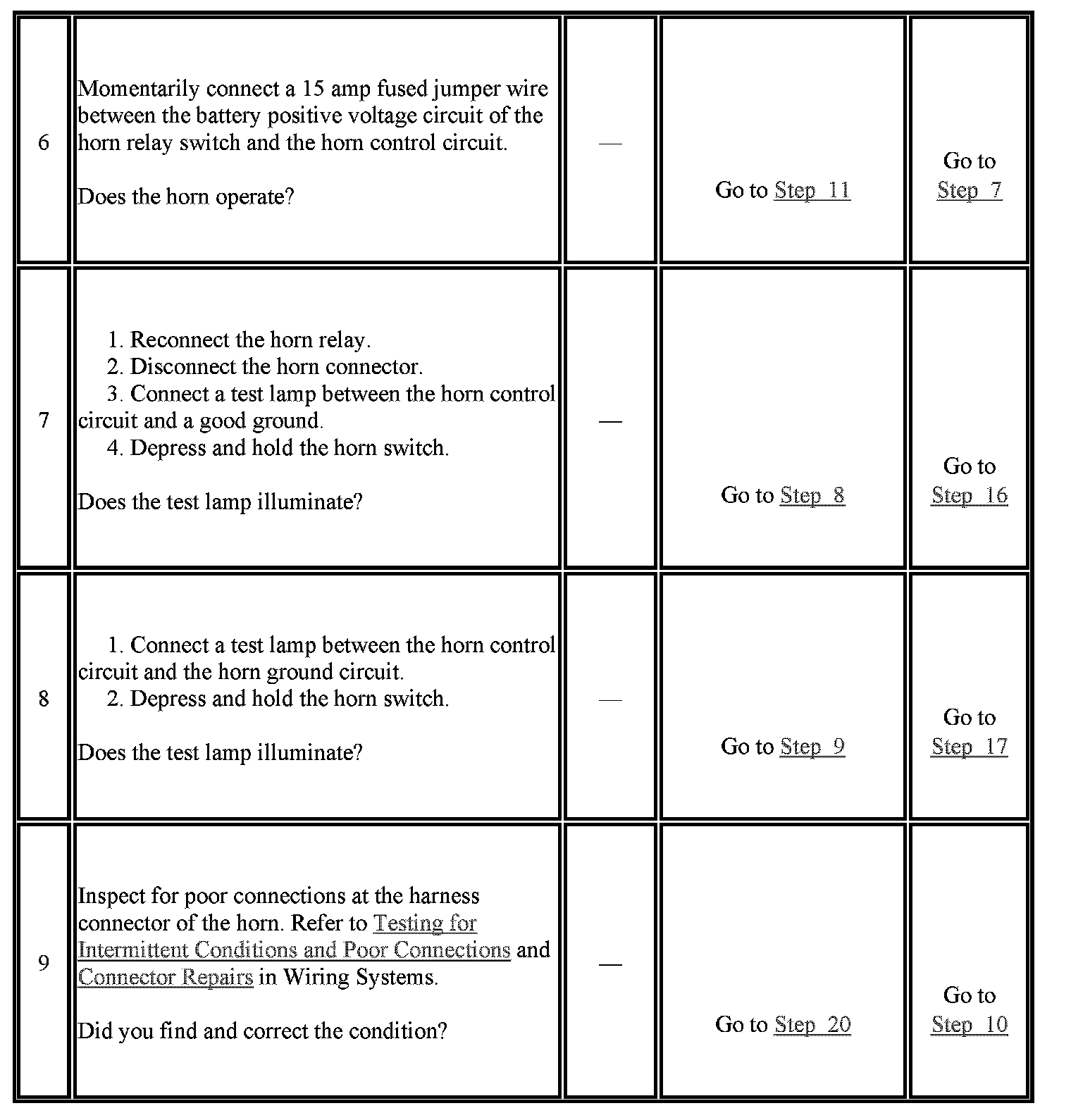 14 The horn relay control circuit includes the horn brush slip ring and the horn switch. The horn brush slip ring and the horn switch must be tested for a high resistance, an open or a short to voltage when testing the relay control circuit.