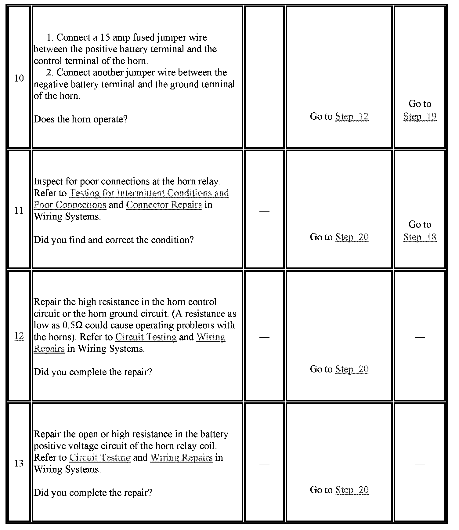 12 The horns need maximum current flow to operate properly. A high resistance (greater than 0.5O) in the horn control circuit or the horn ground circuit could cause operating problems with the horns. Inspect the circuits for faults that would restrict current flow.