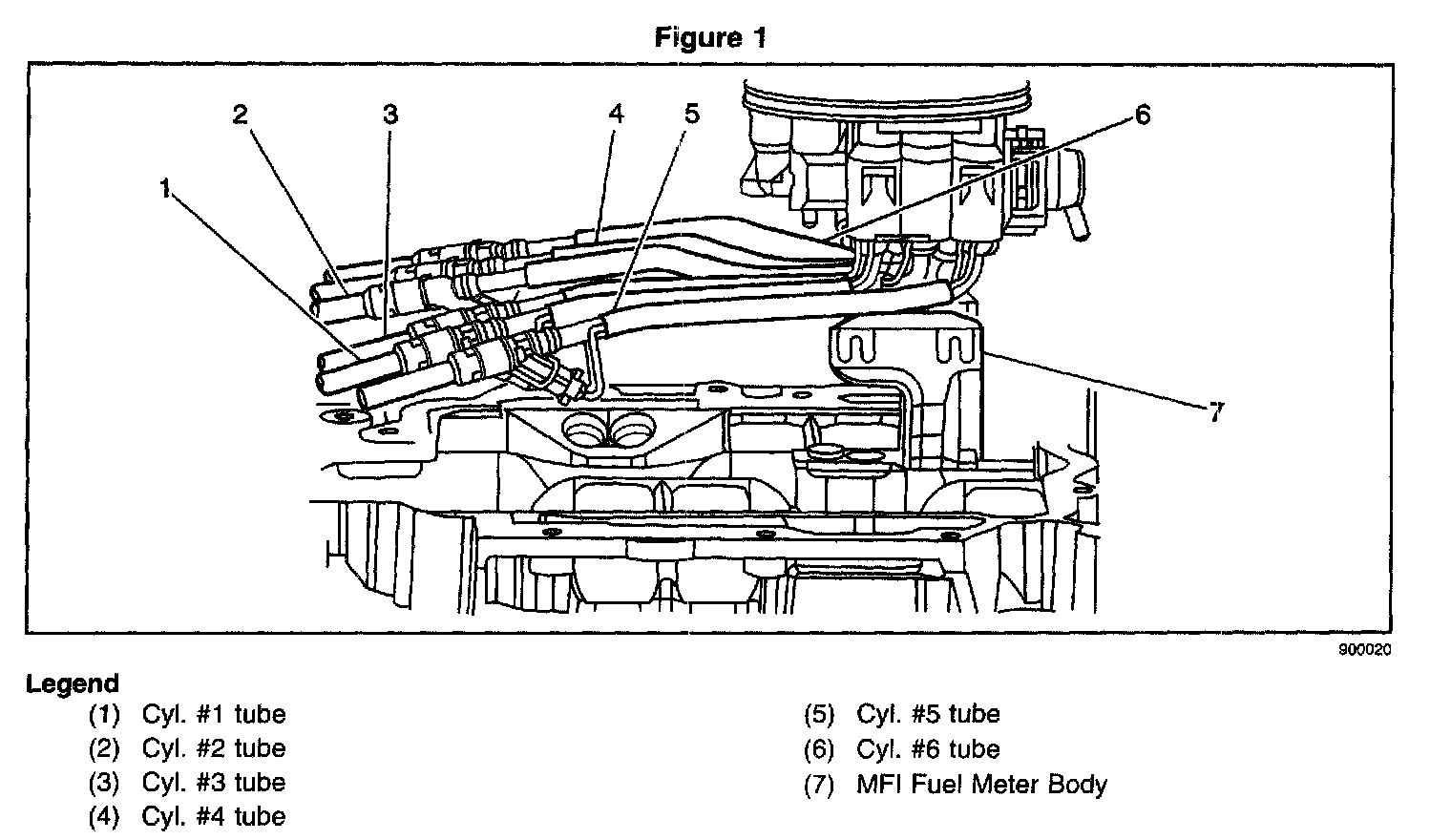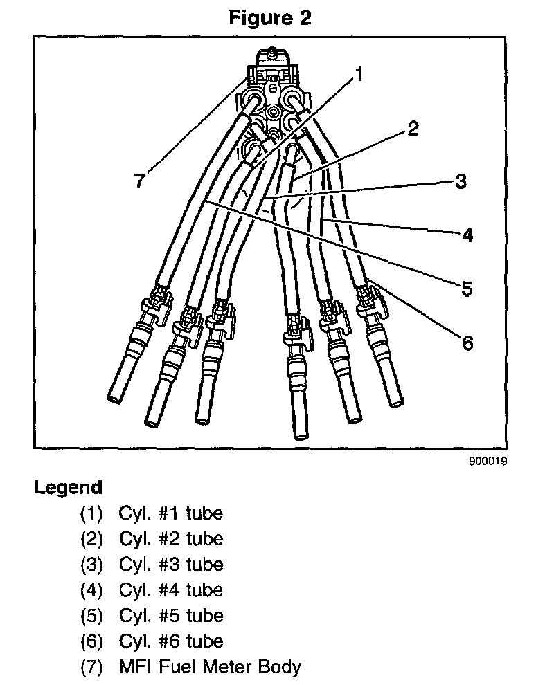 4. Insert the MFI Fuel Meter Body into the Fuel Meter Body Bracket on the Lower Intake Manifold being careful not to bind the Fuel Tubes. Make sure that the number three Fuel Tube is routed in behind number 1 and 5 Fuel Tubes as shown in Figure 2. Push down firmly on the fuel meter body locking it into the bracket.