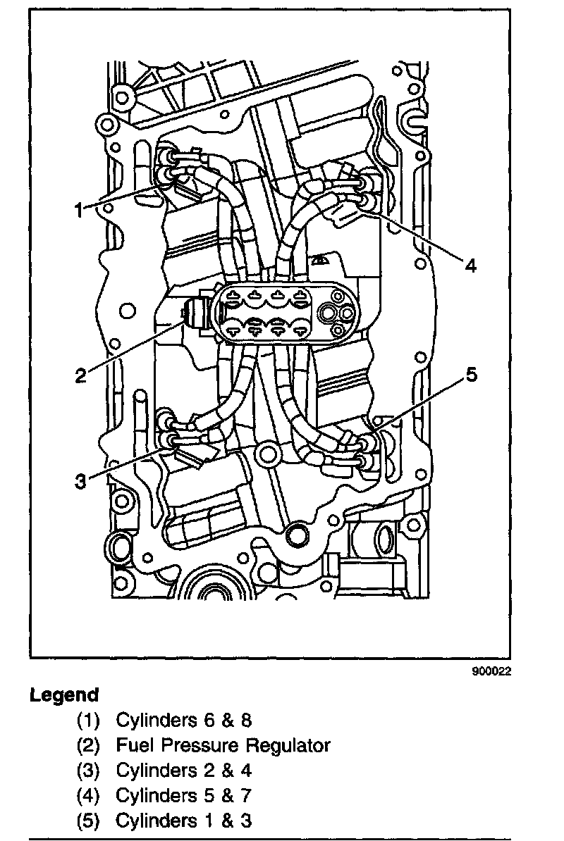 When installing fuel tubes, it is important that the tubes are oriented properly to provide minimal interference when installing the upper intake manifold plenum. Intake holes for cylinders 2, 4, 5, and 7 are closer to the fuel meter body. It is necessary to cross tube 5 over tube 7 and tube 4 over tube 2 as shown in Figure 4.