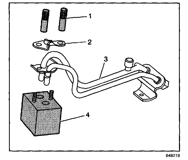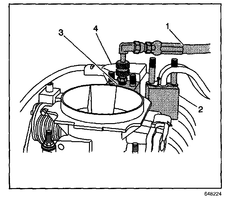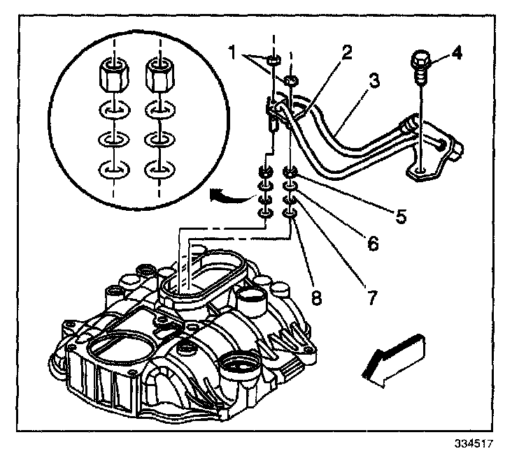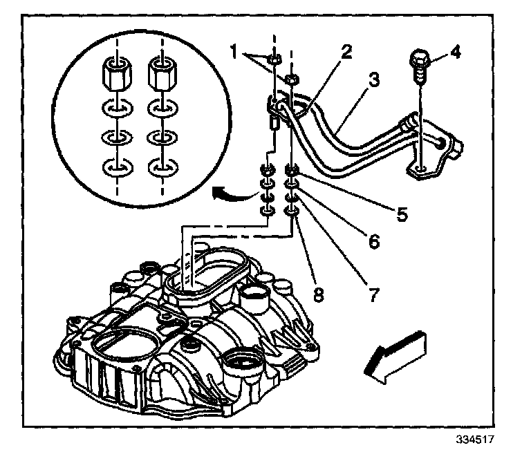 7. Remove the fuel line bolt (4) at the rear of the intake manifold.