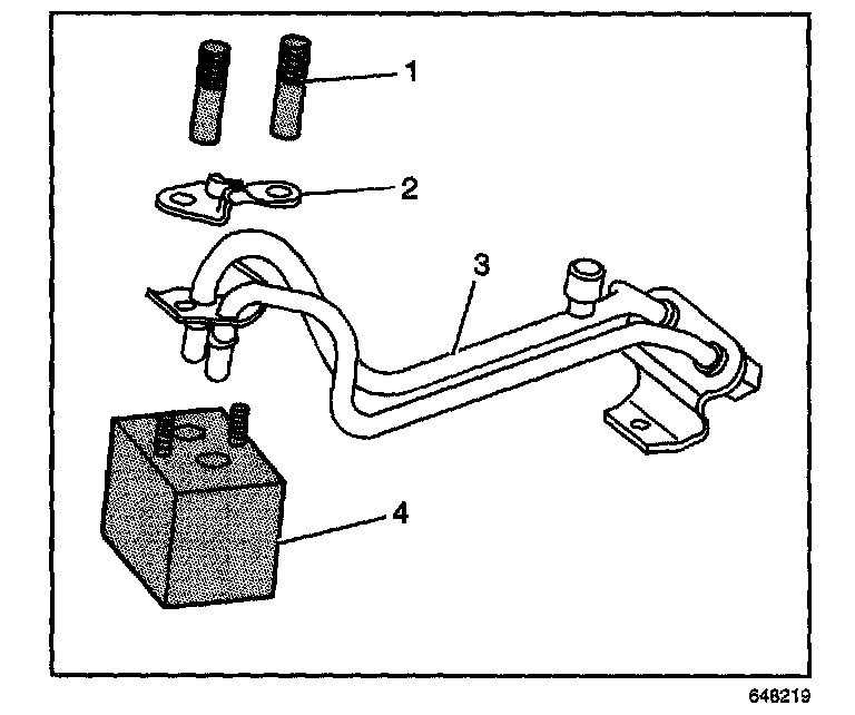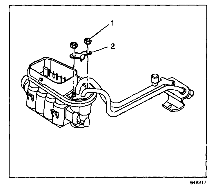 9. Remove the nuts (1) and clamp (2) from the fuel pipe.