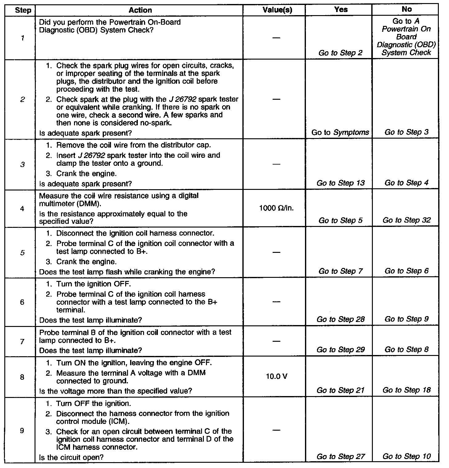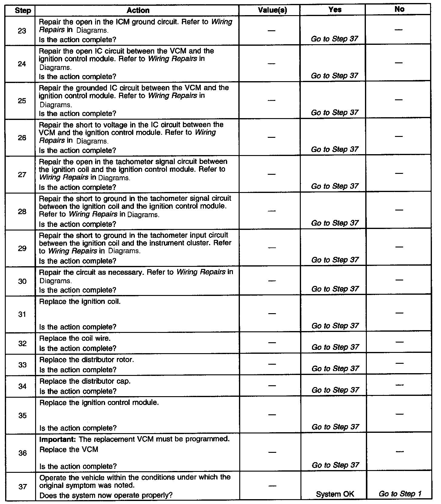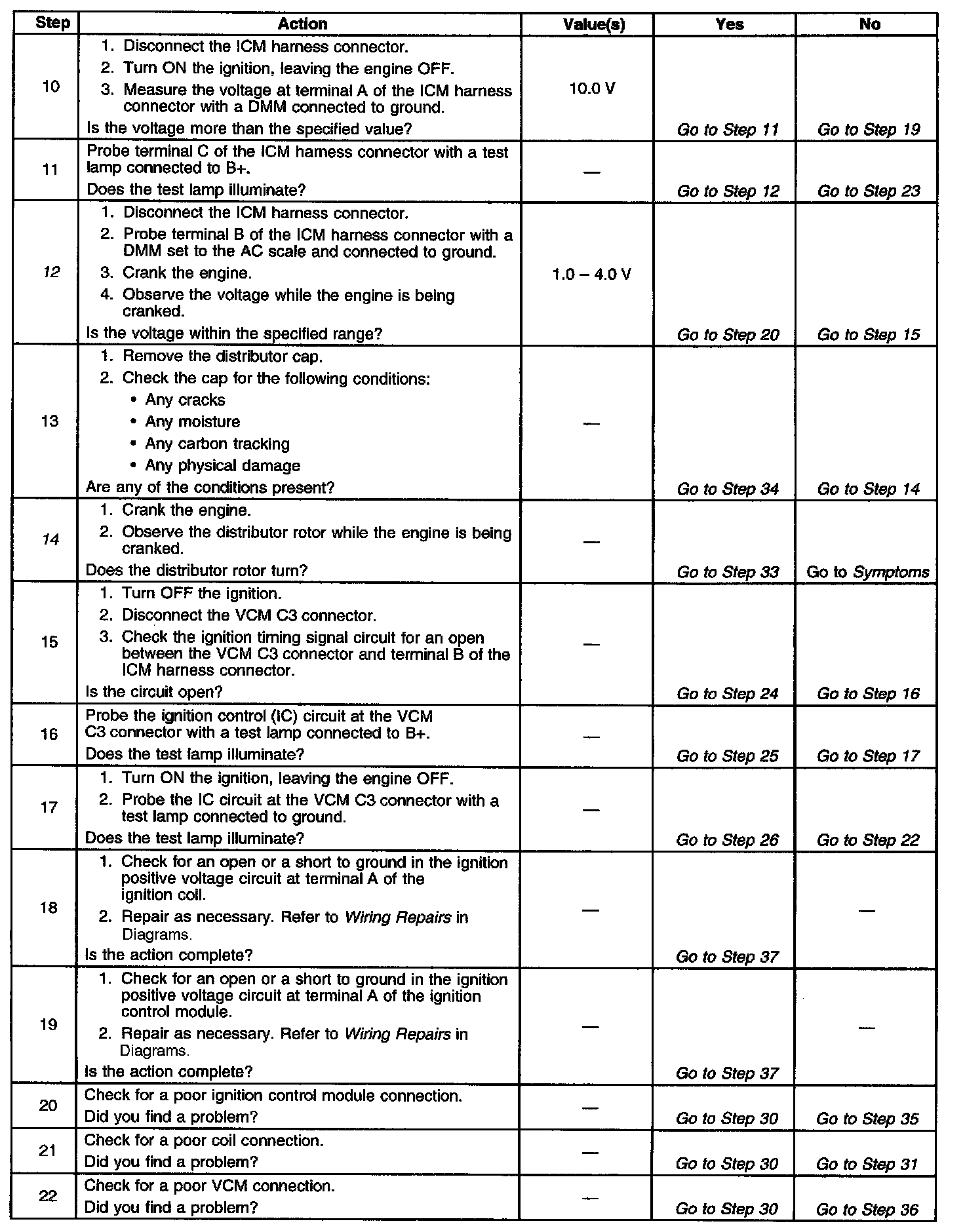 12. This test begins to determine if the VCM is providing a signal to the ignition control module. If the VCM is not providing a signal to the ignition control module, the problem exists between the ignition control module and the VCM.
