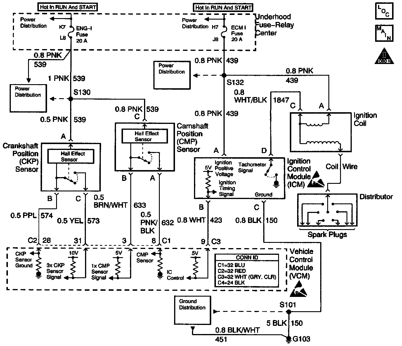 The enhanced ignition system uses the Crankshaft Position (CKP) sensor in order to provide a timing input to the control module. Ignition Control (IC) spark timing for each cylinder is based on this input. The control module provides the ignition timing signal to the Ignition Control Module (ICM) to control the ignition coil. Each timing pulse detected by the ICM allows it to energize the ignition coil. A large secondary ignition voltage is induced in the secondary coil by the primary coil. This high voltage is switched to the correct spark plug by the distributor.