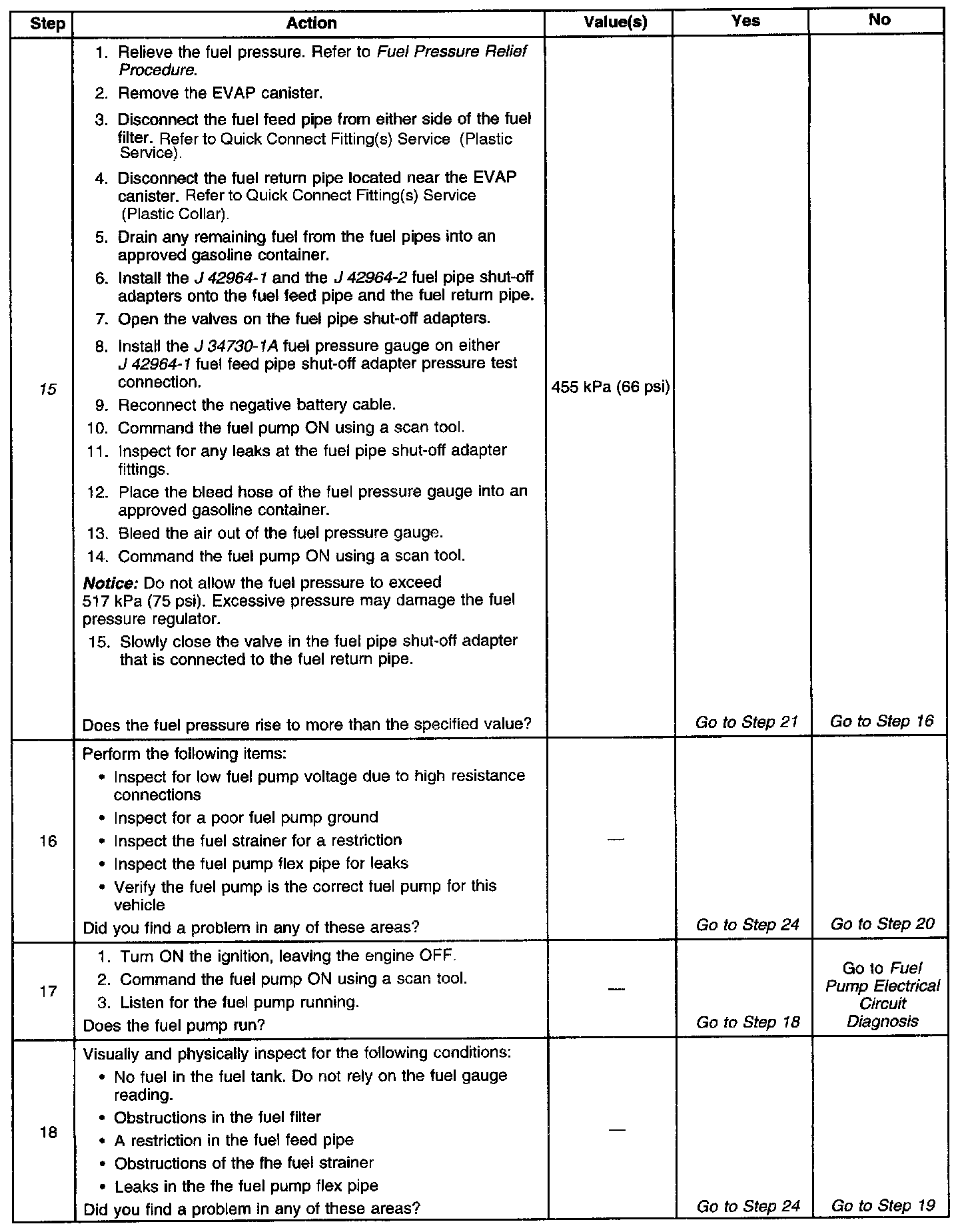 15. Restricting the fuel return pipe with the J 42964-2 fuel pipe shut-off adapter causes the fuel pressure to rise to more than the regulated fuel pressure. Using a scan tool to pressurize the fuel system, the fuel pressure should rise to more than 455 kPa (66 psi) as the valve on the fuel pipe shut-off adapter connected to the fuel return pipe becomes partially closed.