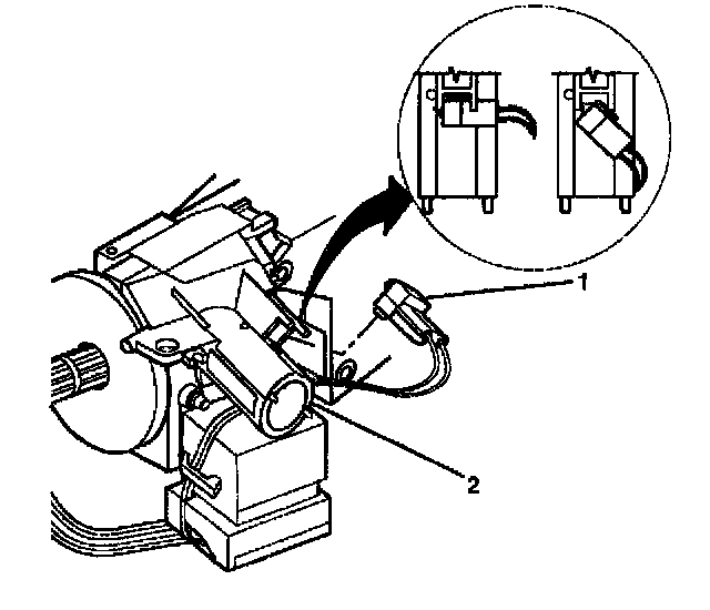 8. Remove the key alarm connector (1) from the lock module assembly (2).