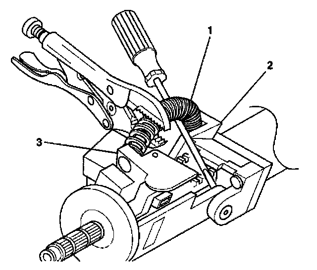 4.2. Secure the tilt spring with locking pliers and continue prying until the tilt spring disengages from the post of the steering column support assembly (3).