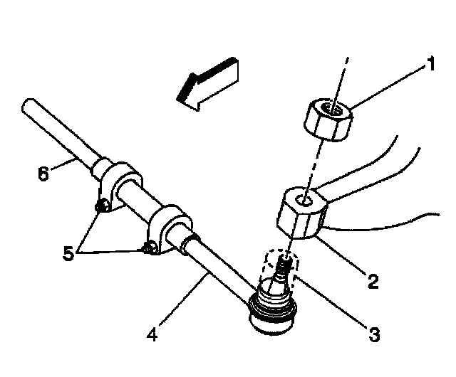 2. Install the tie rod ends to the adjuster tube (1). The number of threads on both the inner and the outer rod ends must be equal to within 3 threads.
