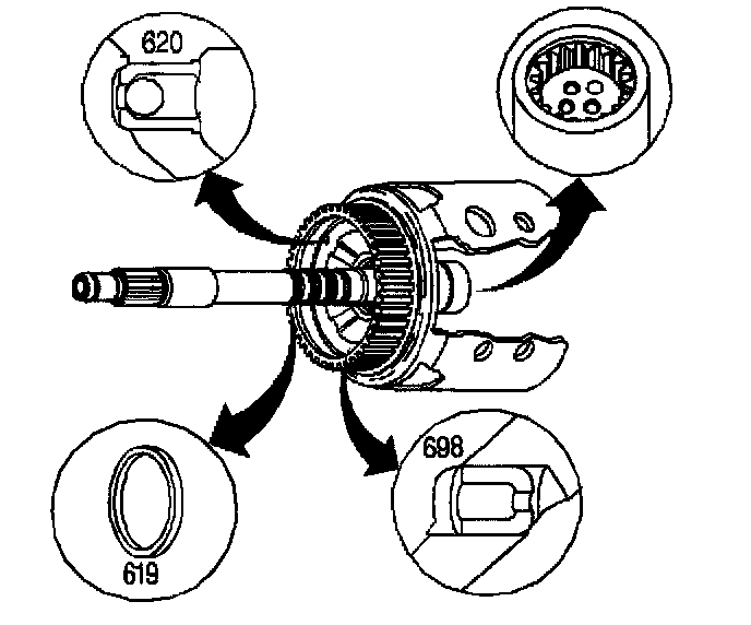 2. Inspect the turbine shaft oil seal ring grooves for damage or burrs. The oil seal rings (619) must fit loose into the ring grooves.