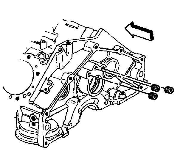 Insert a 3/8 x 26 inch rod into the rear oil gallery holes in order to drive out the front engine block oil gallery plugs.