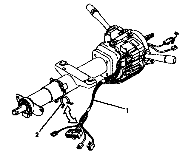 4. Remove the wire harness assembly (1) from the wire harness strap (2).