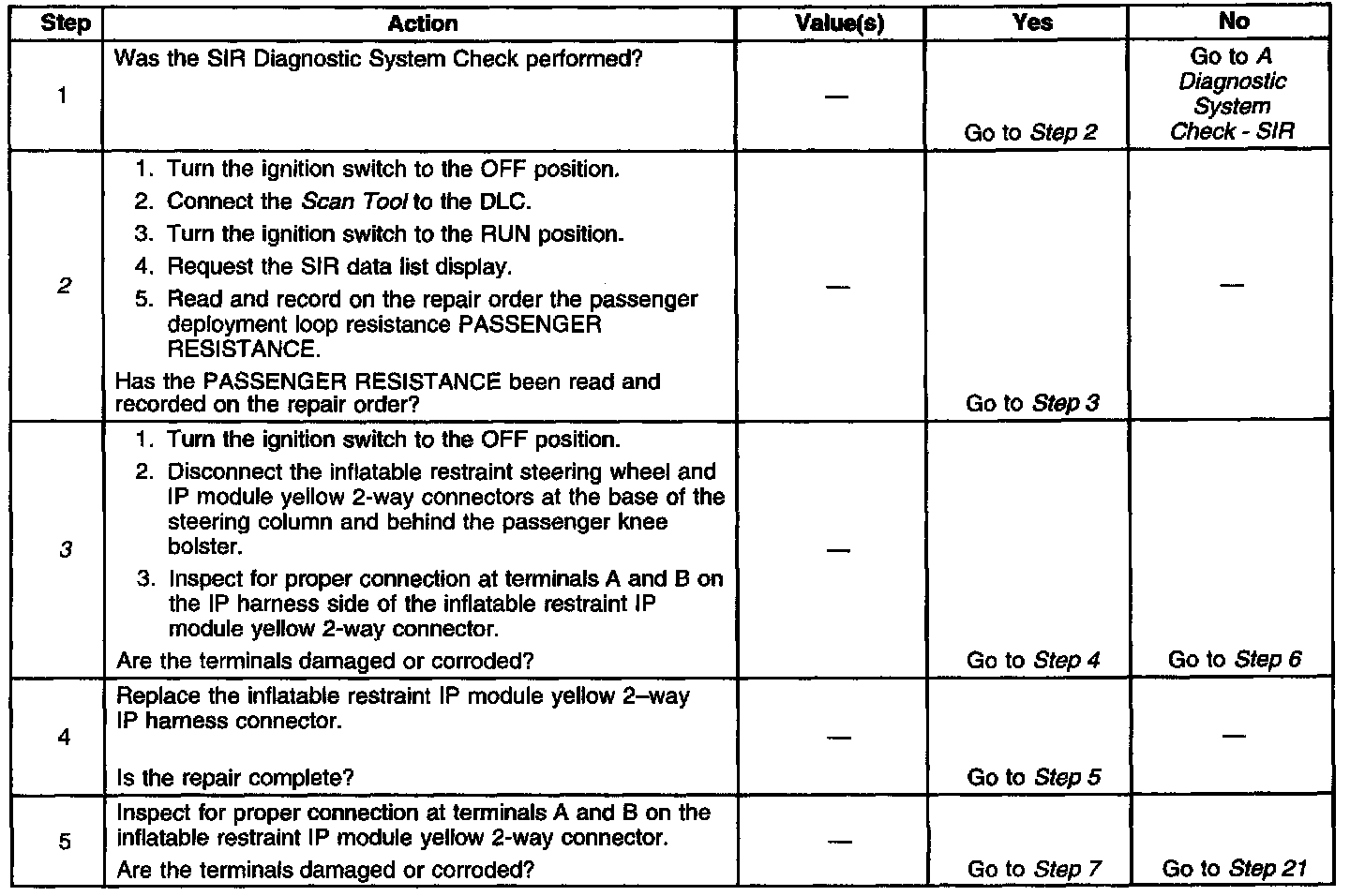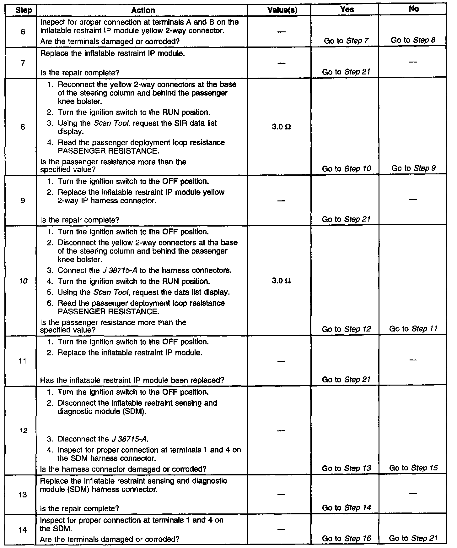 The diagnostic table directs the technician to note the entry value of PASSENGER RESISTANCE. Comparing the value of PASSENGER RESISTANCE over multiple ignition cycles may be helpful in determining if an intermittent condition exists. When measurements are requested in this table, use the J 39200 Digital Multimeter with the correct terminal adapter from the J 35616-A Connector Test Adapter Kit. When an inspection for proper connection is requested, refer to Testing for Intermittent and Poor Connections in Diagrams. When a wire, connector or terminal repair is requested, use the J 38125-B Terminal Repair Kit. Refer to Wiring Repairs in Diagrams.