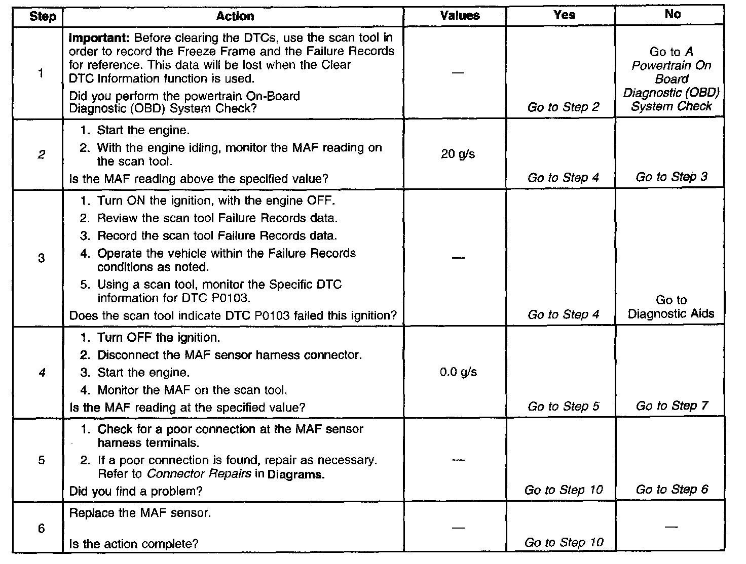 2. A damaged harness. Inspect the wiring harness for damage. If the harness appears to be OK, observe the scan tool while moving connectors and wiring harnesses related to the MAF sensor. A change in the display will indicate the location of the fault.