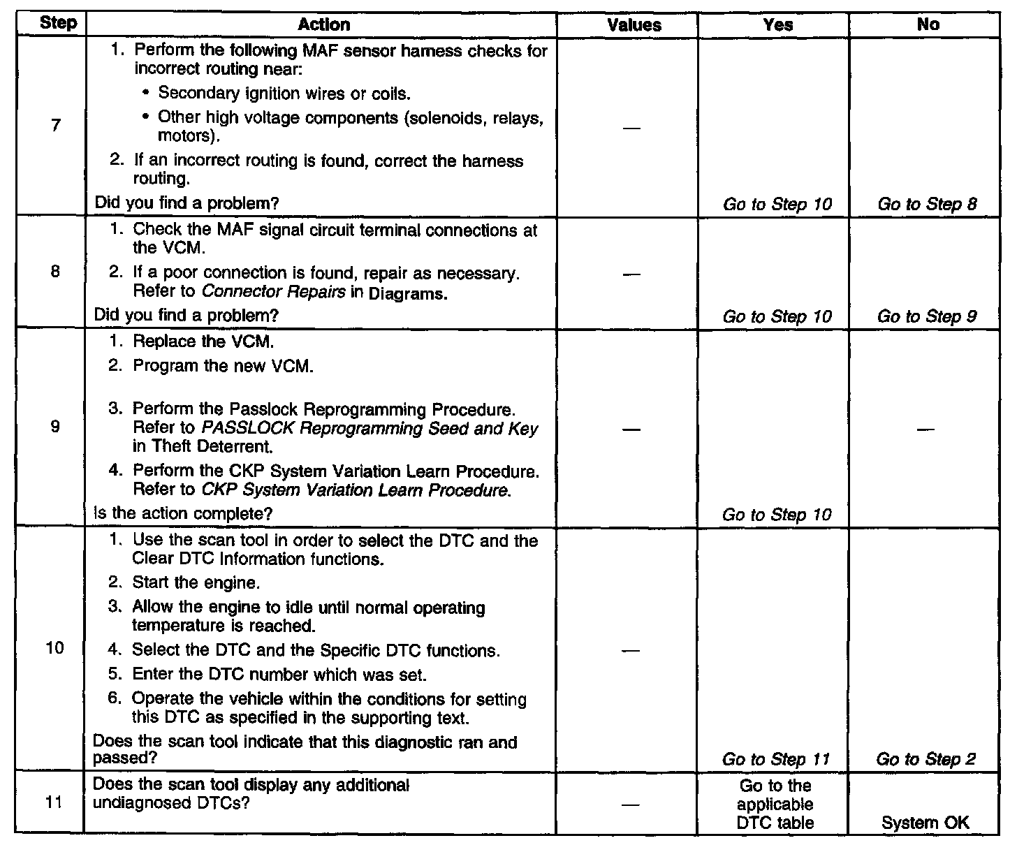 This DTC is designed to detect an unusually high MAF sensor signal frequency. If the VCM detects a MAF signal frequency above the possible range of a normally operating MAF sensor, this DTC will be set.