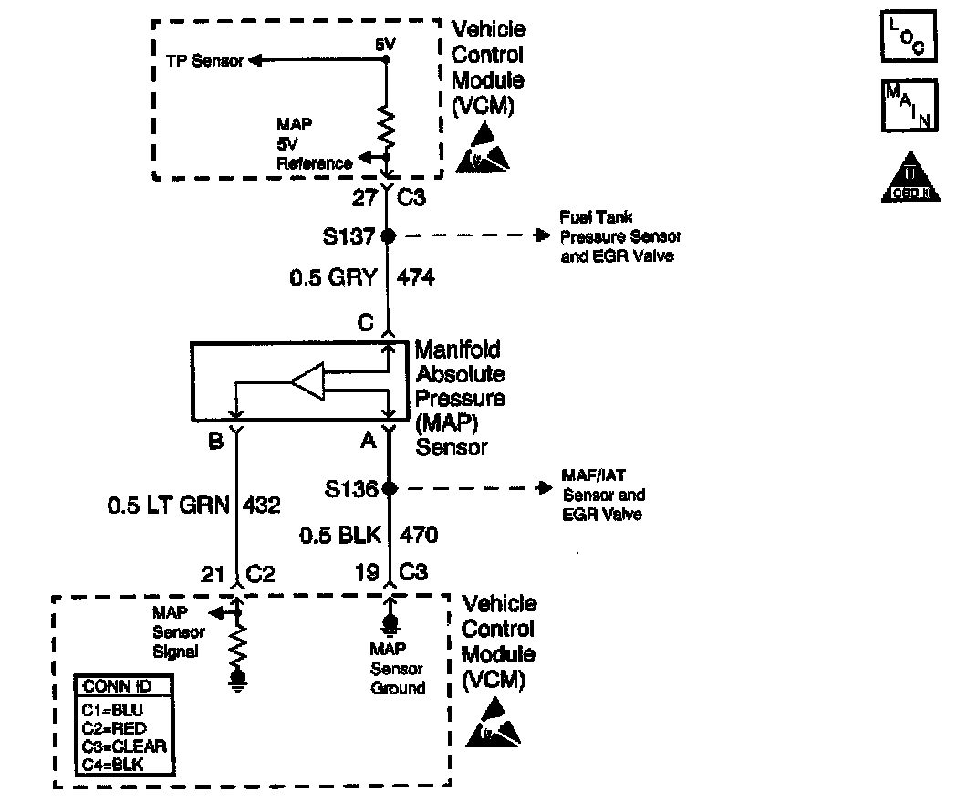 The Manifold Absolute Pressure (MAP) sensor is a pressure sensor. The control module supplies the MAP sensor a reference voltage, signal, and ground circuits. When manifold vacuum is low, the MAP sensor signal voltage rises to a value near the reference voltage, and the MAP sensor signal voltage decreases when the manifold vacuum increases. The control module monitors the MAP sensor signal circuit voltage in order to calculate the vacuum within the intake manifold.