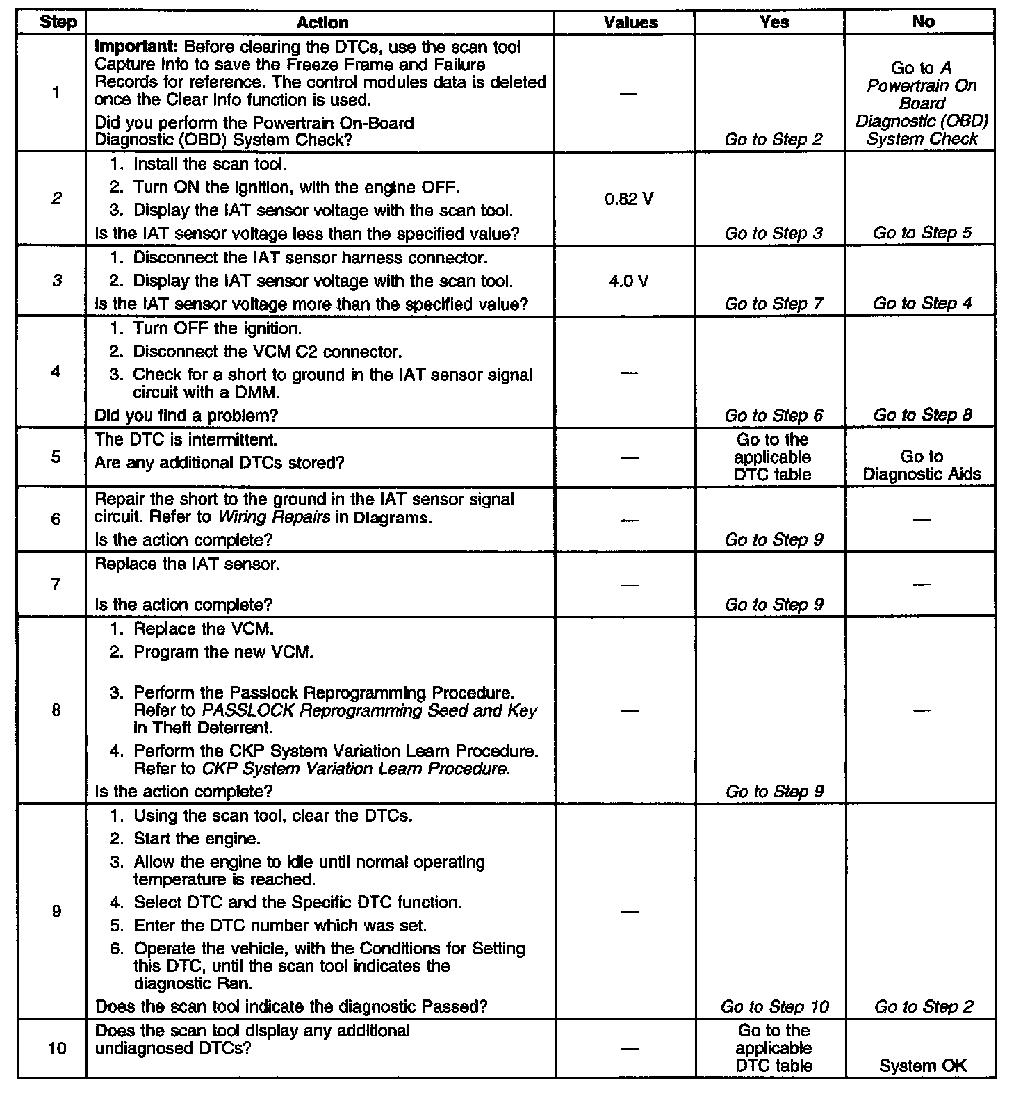 This DTC is designed to detect an IAT sensor signal voltage lower than possible in a normally operating IAT sensor.
