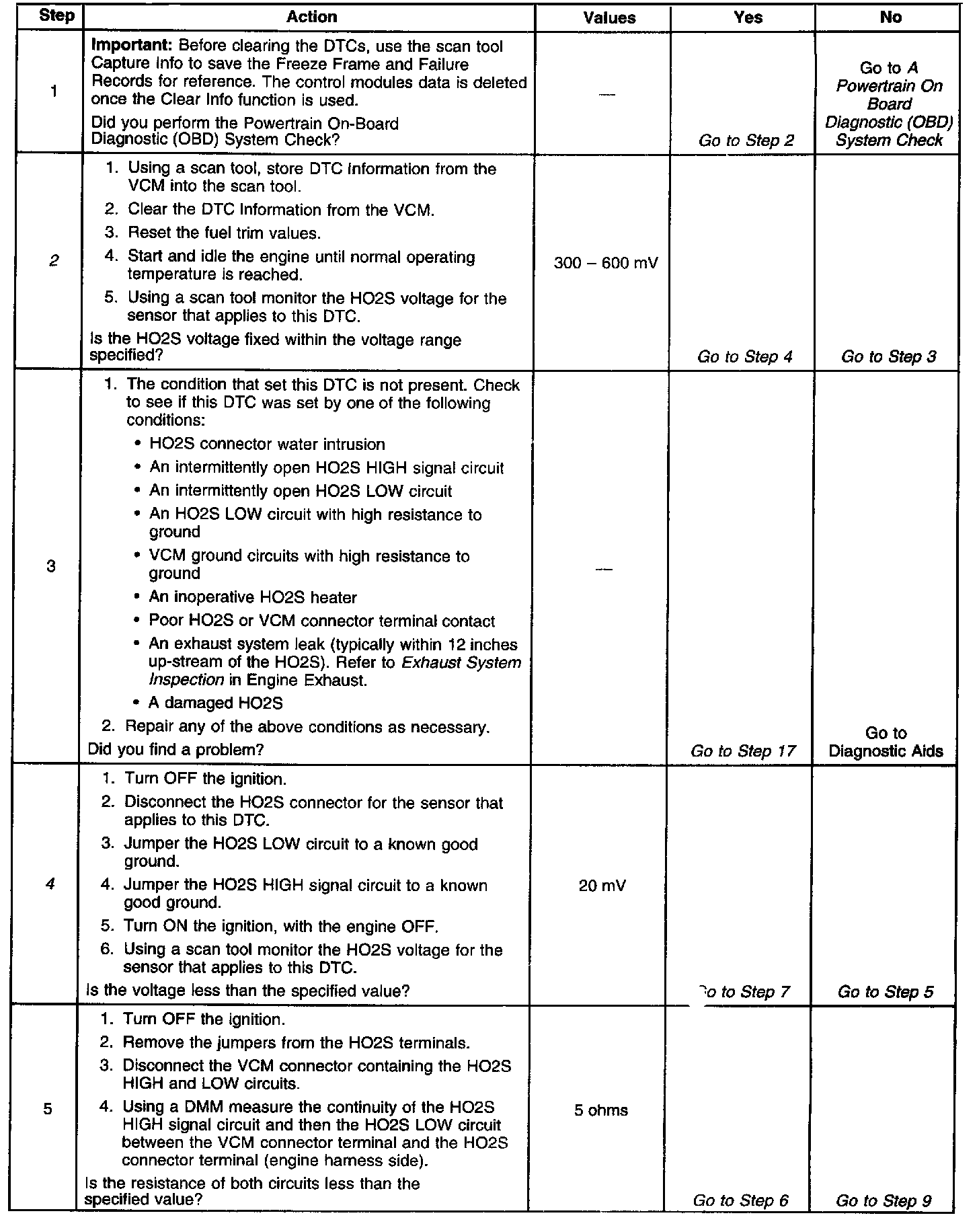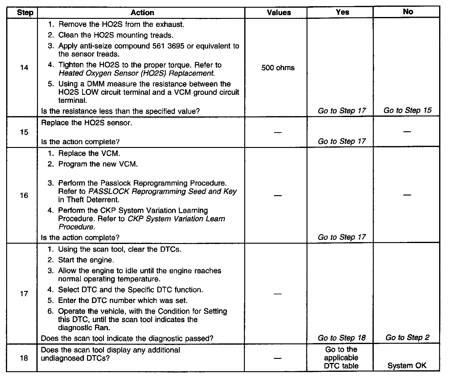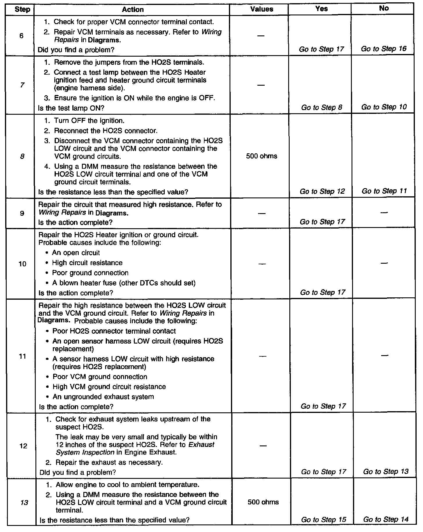 13. This step checks for proper circuit resistance between the HO2S LOW circuit and VCM ground with a COLD sensor. A loose HO2S or poor thread to exhaust electrical contact will cause higher resistance when the HO2S is cold. Although 500 ohms is allowed, typical resistance should be less than 50 ohms.