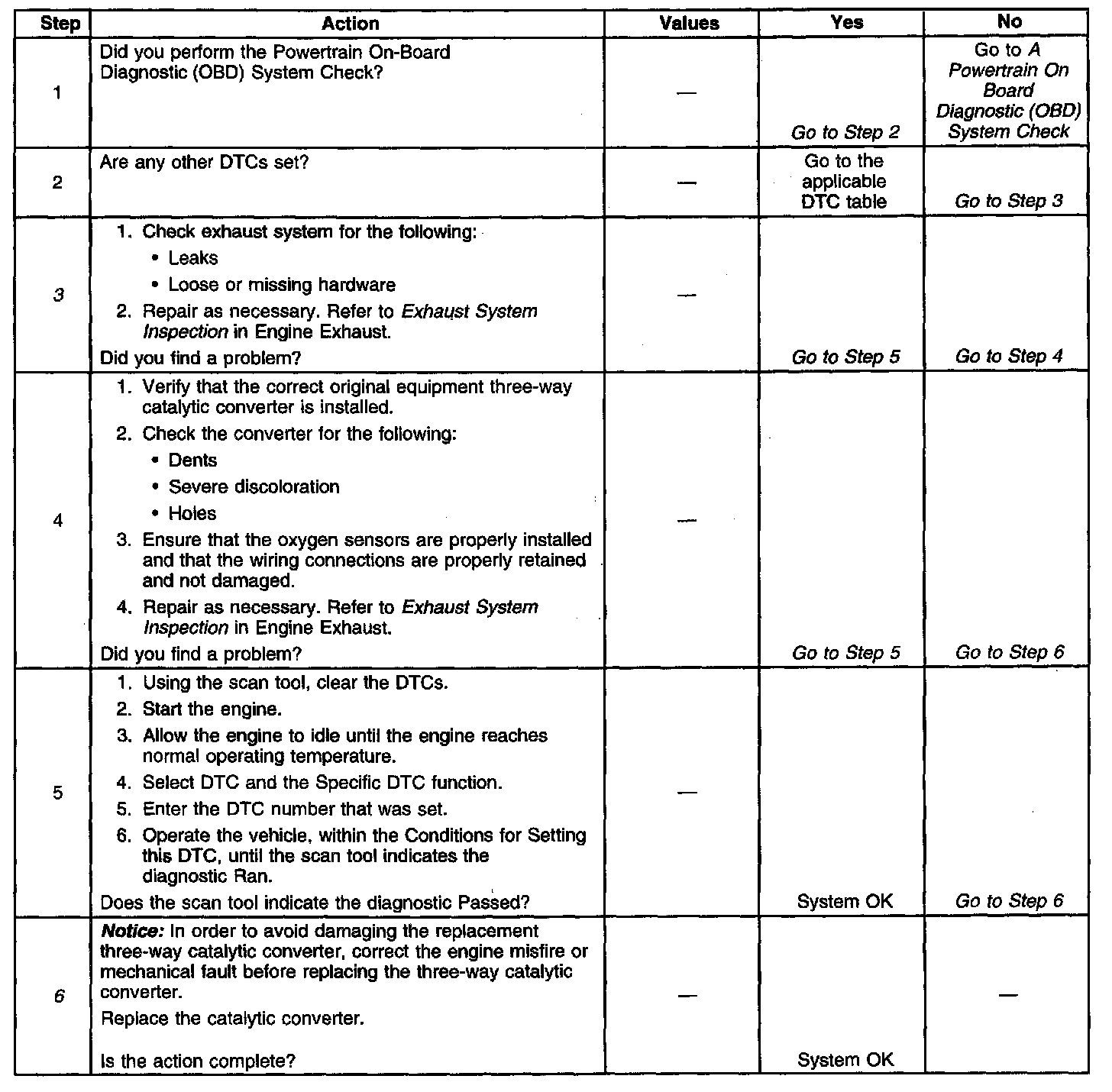 3. This table checks for conditions that can cause the three-way catalytic converter efficiency to appear degraded. Inspect and repair exhaust system as necessary.