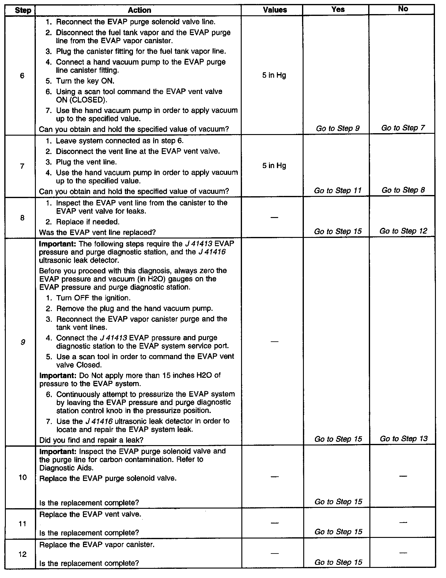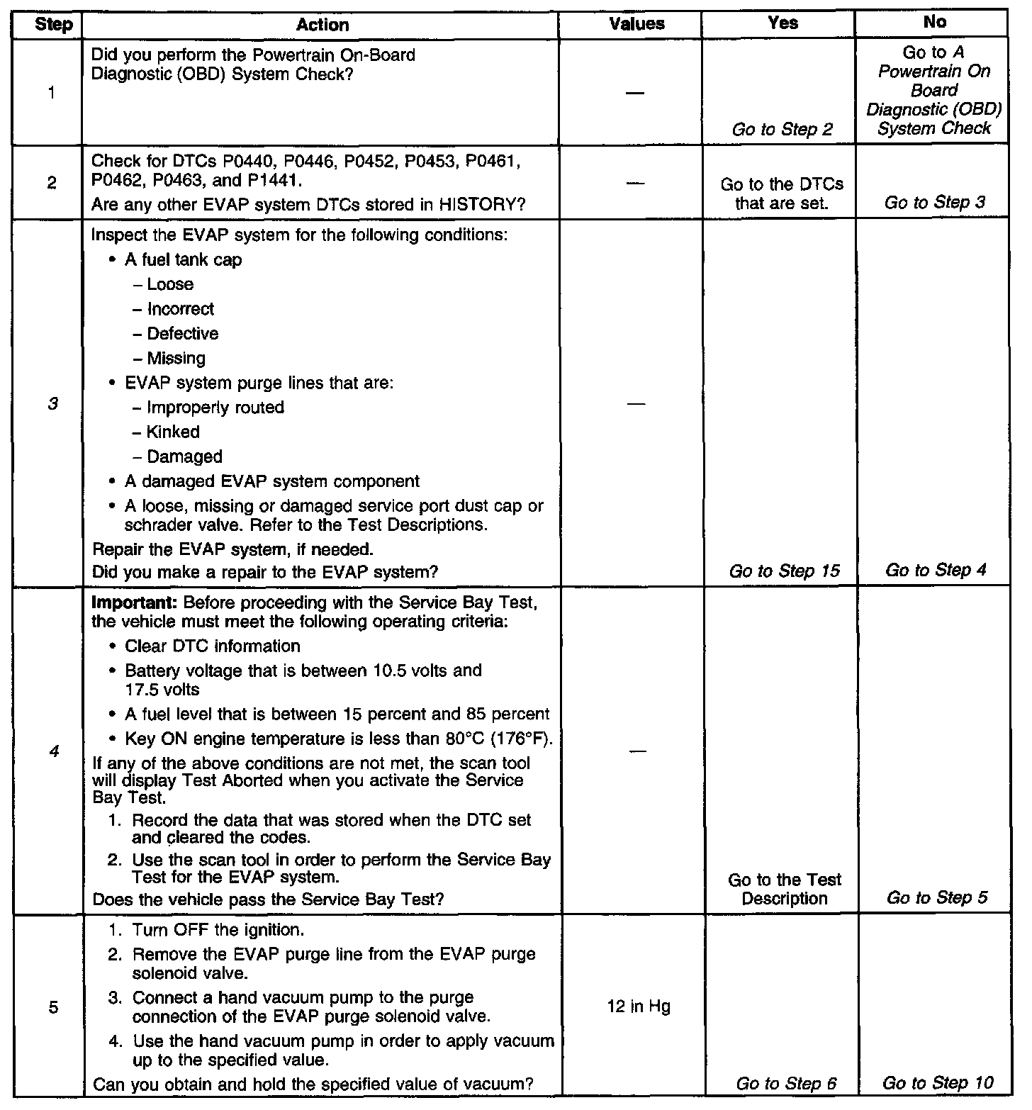 IMPORTANT: An accurate indication of fuel level is required for the VCM to properly Pass or Fail this DTC. Always diagnose fuel level sensor DTCs before performing this DTCs diagnostic table. Always check for fuel level sensor DTCs stored in History.