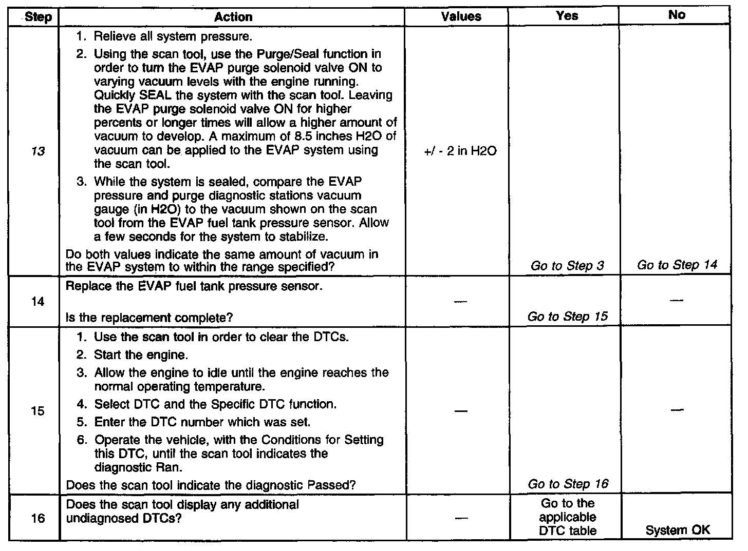 13. An EVAP pressure sensor that does not correctly respond to pressure or to vacuum will cause this DTC to set.
